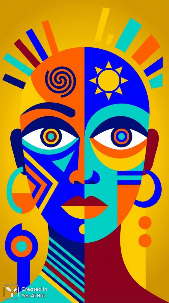 Яркий этнический портрет, выполненный в современной графической манере с использованием смелых цветов и геометрических орнаментов. Дизайн отличается разделением лица пополам, создавая динамичный визуальный эффект. Большие стилизованные глаза привлекают внимание, подчеркивая выразительность образа. Насыщенный фон служит отличным контрастом для ярких деталей и абстрактных элементов, добавляя композиции глубину и сложность. В портрете органично сочетаются культурные символы, отражающие богатую историю и традиции определенного народа. При этом используется минималистичный подход к деталям, что позволяет сохранить чистоту линий и лаконичность формы. В результате получается работа с поразительным визуальным воздействием, способная вызвать сильные эмоции у зрителя. Это современное переосмысление традиционного этнического искусства, сочетающее в себе уважение к культурному наследию и стремление к инновациям в области графического дизайна. Портрет излучает энергию, силу и красоту, являясь ярким примером современного художественного выражения. Он демонстрирует гармоничное взаимодействие различных элементов, создавая целостное и запоминающееся произведение искусства. Композиция продумана до мелочей, каждый элемент играет свою роль в создании общего впечатления