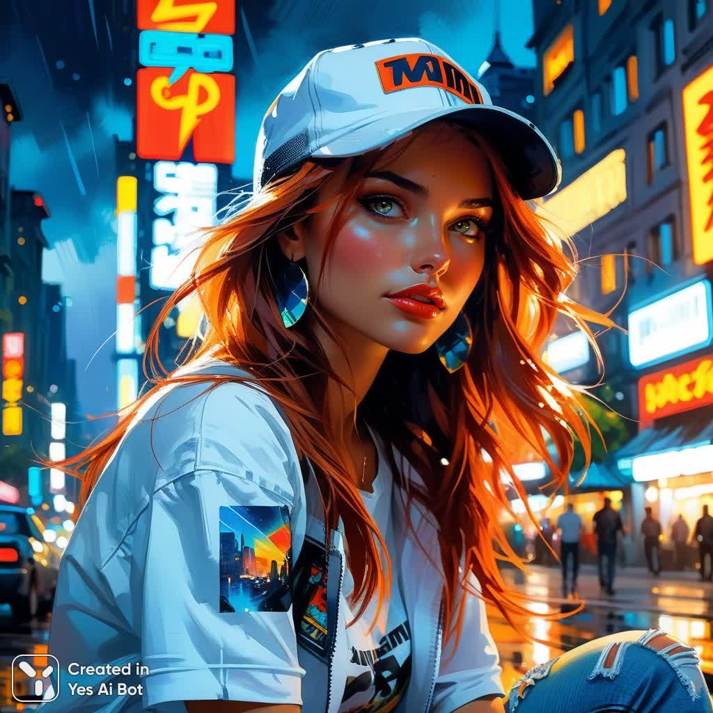 Завораживающий портрет молодой женщины славянской внешности, словно сошедший с полотна известного художника Михаила Гармаша. Её лицо, обрамлённое густыми бакенбардами и длинными медными волосами, ниспадающими небрежными прядями, притягивает взгляд своей выразительностью. Высокие скулы подчеркивают аристократичность черт, добавляя образу загадочности и глубины. На девушке – белая футболка с оригинальным принтом в виде грозового неба, создающим эффект неожиданного контраста с её светлым образом. Рваные джинсы придают аутентичный городской шарм, а лёгкая кепка завершает стильный ансамбль. Фон картины представляет собой ночной вид мегаполиса: панорама небоскребов, залитых неоновым светом, создаёт ощущение динамики и футуристической энергии. Изображение выполнено в технике смешанной живописи – акварель и акрил, что придаёт картине особую текстурность и глубину. Мягкий фокус и большая глубина резкости позволяют зрителю насладиться мельчайшими деталями: от драматических теней до насыщенных цветов. Яркие краски, высокая контрастность и использование неоновых оттенков создают эффектную визуальную композицию, наполненную энергией и современным стилем. Вся картина пронизана духом городской элегантности и динамики, демонстрируя гармоничное сочетание красоты, стиля и уличной эстетики. Гиперреализм исполнения передает мельчайшие детали кожи, волос и тканей, создавая ощущение присутствия и погружая зрителя в атмосферу ночного города. Это произведение искусства – ода современной женской красоте и силе духа, воплощённая в ярких красках и смелых художественных решениях