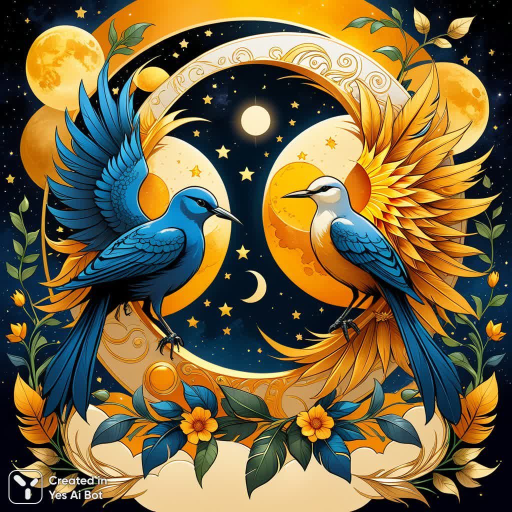 create an image of a stylized sun and moon with a symmetrical design, featuring two birds perched on either side. the sun and moon should be depicted with a warm golden hue, and the birds should be rendered in a realistic yet artistic manner, with detailed feathers and a lifelike posture. surrounding the celestial bodies, include a variety of botanical