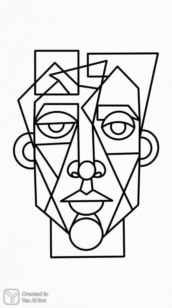 Черно-белый портрет мужчины в стиле кубизма и упрощенной графике для раскрашивания без заливки цветом - Пример работы нейросети NanoBanana