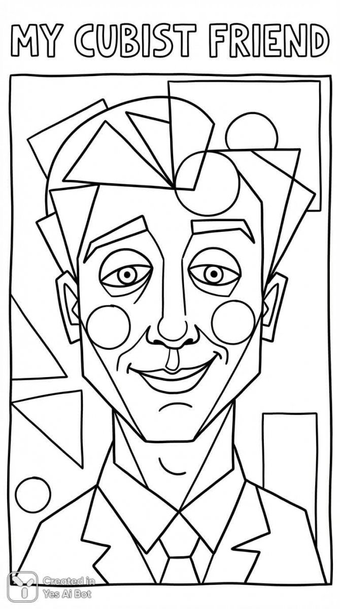 Портрет мужчины, выполненный в стиле кубизма, представляет собой увлекательное сочетание геометрических форм и линий, создающих уникальный визуальный образ. Акцент сделан на четких, от руки нарисованных контурах, что придает работе особую индивидуальность и шарм. Минималистичный дизайн позволяет сосредоточиться на основных чертах лица и передать характерную игру света и тени. Использование черно-белой графики добавляет портрету элегантности и вневременной привлекательности, подчеркивая его художественную ценность. Необычные углы обзора создают динамику композиции и стимулируют воображение зрителя, приглашая к детальному изучению каждой линии и формы. Данный рисунок идеально подходит для детской раскраски, где его упрощенная структура позволит малышам легко проявить свою креативность и развить навыки мелкой моторики. Выразительное и игривое выражение лица мужчины вызывает положительные эмоции и создает ощущение тепла и дружелюбия, делая этот портрет прекрасным выбором для юных художников. Это не просто изображение, а окно в мир искусства, которое вдохновляет на творчество и самовыражение. Работа выполнена с любовью к деталям и вниманием к пропорциям, что делает её настоящим произведением искусства, доступным даже самым маленьким зрителям
