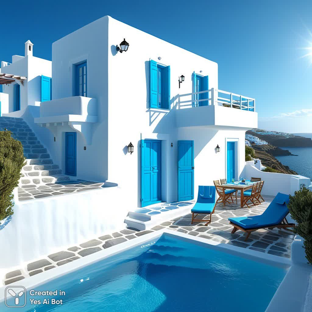 stable diffusion Вилла на Миконосе: Бесконечная морская панорама и средиземноморский шарм. Генерация из нейронной сети Stable Diffusion