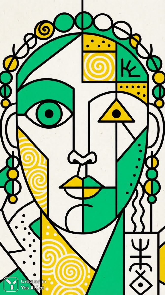 Яркий этнический портрет, выполненный в стиле минималистичной графики, представляет собой завораживающее сочетание утонченной детализации и смелых акцентов. В центре внимания — крупный план лица, чьи черты подчеркнуты резкими, четкими линиями, создающими эффект стилизации. Лицо разделено на секции, каждая из которых украшена сложными, замысловатыми узорами, напоминающими традиционные орнаменты различных культур. Цветовая палитра построена вокруг сочных оттенков зеленого и желтого, которые гармонично переплетаются между собой, придавая изображению энергию и живость. Эти акцентные цвета не только привлекают внимание к ключевым элементам портрета, но и создают ощущение тепла и оптимизма. Композиция выдержана в духе минимализма — чистые линии, отсутствие лишних деталей и продуманное расположение элементов способствуют созданию гармоничного и сбалансированного образа. Текстуры добавлены графическим способом, имитируя различные материалы и поверхности, что придает портрету глубину и объем. В целом, это произведение искусства представляет собой современную интерпретацию этнической красоты, сочетающую в себе традиционные мотивы и современные художественные техники. Оно отражает уважение к культурному наследию и одновременно демонстрирует творческий подход к визуальному выражению. Портрет излучает силу, уверенность и неповторимый шарм