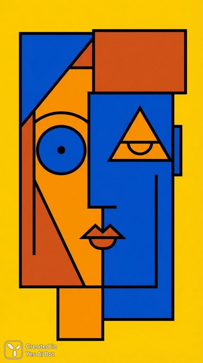 Яркий кубистический портрет, воплощающий смелое сочетание цветов и геометрических форм, захватывает взгляд своей динамикой и контрастом. Насыщенный синий цвет уравновешивается энергичным оранжевым, создавая визуальное напряжение и притягивая внимание к центральному образу. Лицо стилизовано, упрощено до ключевых элементов, но сохраняет выразительность благодаря тщательно проработанным деталям. Четкие графические линии черного цвета акцентируют структуру портрета, добавляя ему современности и динамизма. Особое внимание привлекают глаза – симметричные, но с различным выражением, что создает ощущение глубины и сложной внутренней жизни персонажа. Плоская композиция подчеркивает плоскостность кубистического стиля, а яркий желтый фон усиливает визуальный эффект и выделяет портрет на общем фоне. Это произведение искусства – современное переосмысление классической темы портрета, выполненное в духе кубизма с использованием смелых цветовых решений и графических приемов. Картина излучает энергию, индивидуальность и отражает стремление к новаторству в искусстве, предлагая зрителю уникальный взгляд на мир через призму абстрактной геометрии и ярких красок, представляя собой пример современного художественного выражения с акцентом на визуальную силу и эмоциональное воздействие. Безусловно, это произведение станет украшением любой коллекции современного искусства