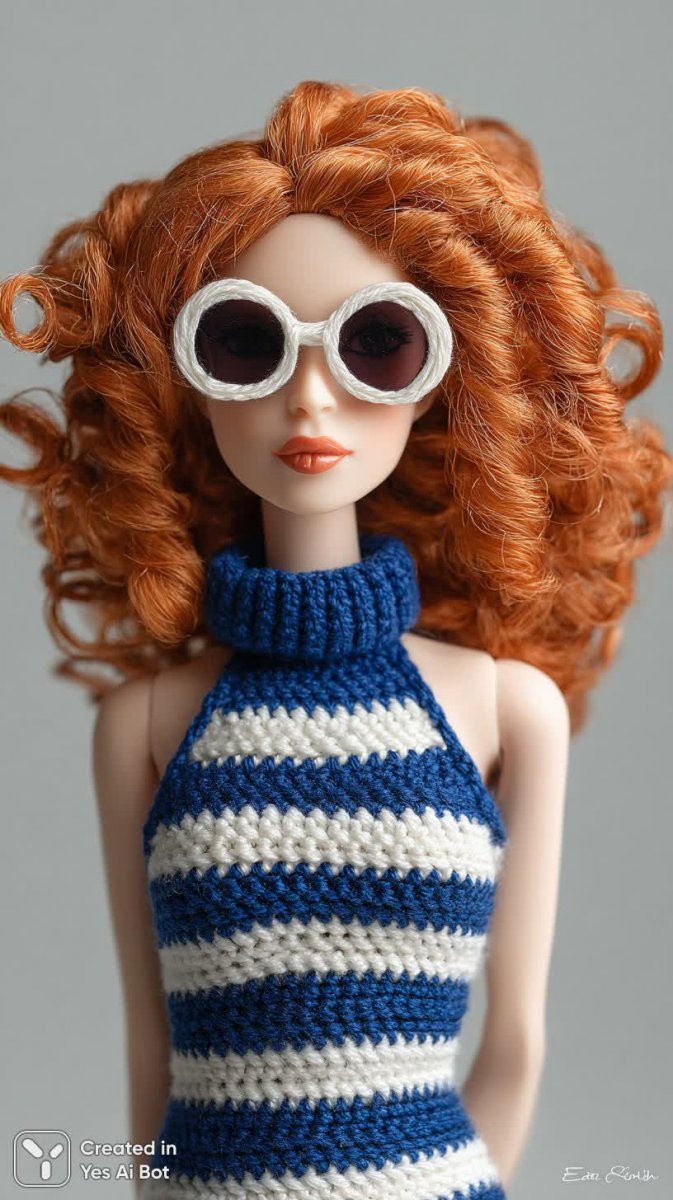 Изысканная амигуручи-кукла ручной работы, воплощающая летнее настроение и беззаботность. Яркие рыжие волосы игриво обрамляют лицо, подчеркнутое стильными солнцезащитными очками – деталью, придающей образу дерзость и индивидуальность. Кукла одета в очаровательный пляжный купальник с контрастным сочетанием синего и белого цветов. Модель выполнена в классическом стиле слитного купальника, отличающегося элегантной горловиной-халтером и короткими рукавами, что добавляет легкости и свободы движений. Использование яркого освещения создает эффектную визуализацию, подчеркивая красоту текстуры связанного крючком полотна и насыщенность цветов. Эта кукла – идеальный аксессуар для создания уютной атмосферы, отличный подарок любителям ручного творчества и коллекционерам милых игрушек. Она станет прекрасным украшением интерьера, добавляя нотку тепла и оригинальности в любой дом. Тщательная проработка деталей, от аккуратных швов до выразительного взгляда, делают эту куклу поистине уникальным произведением искусства, которое будет радовать глаз долгие годы. Ее позитивный образ излучает оптимизм и энергию, даря хорошее настроение всем, кто на нее смотрит