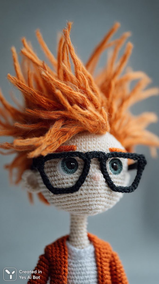 Детализированный крупный план лица куклы, выполненной крючком, демонстрирует яркий и запоминающийся образ. Оранжевые волосы, уложенные в небрежный, слегка растрепанный стиль с выраженными завитками, придают кукле игривый и дерзкий вид. Черная оправа очков добавляет нотку интеллектуальности и загадочности, подчеркивая уникальный характер этой рукодельной игрушки. Выражение лица куклы лукавое и беззаботное, словно она готова к новым приключениям. Простой белый фон акцентирует внимание на деталях вязаного портрета, позволяя оценить мастерство исполнения и оригинальность дизайна. Текстура шерстяной нитки создает ощущение тепла и уюта, а яркий цвет волос добавляет динамики и энергии в композицию. Эта крошечная кукла – воплощение креативности и ручного труда, способная украсить любой интерьер или стать прекрасным подарком для ценителей уникальных вещей. Ее забавный взгляд и необычный стиль не оставят равнодушным никого