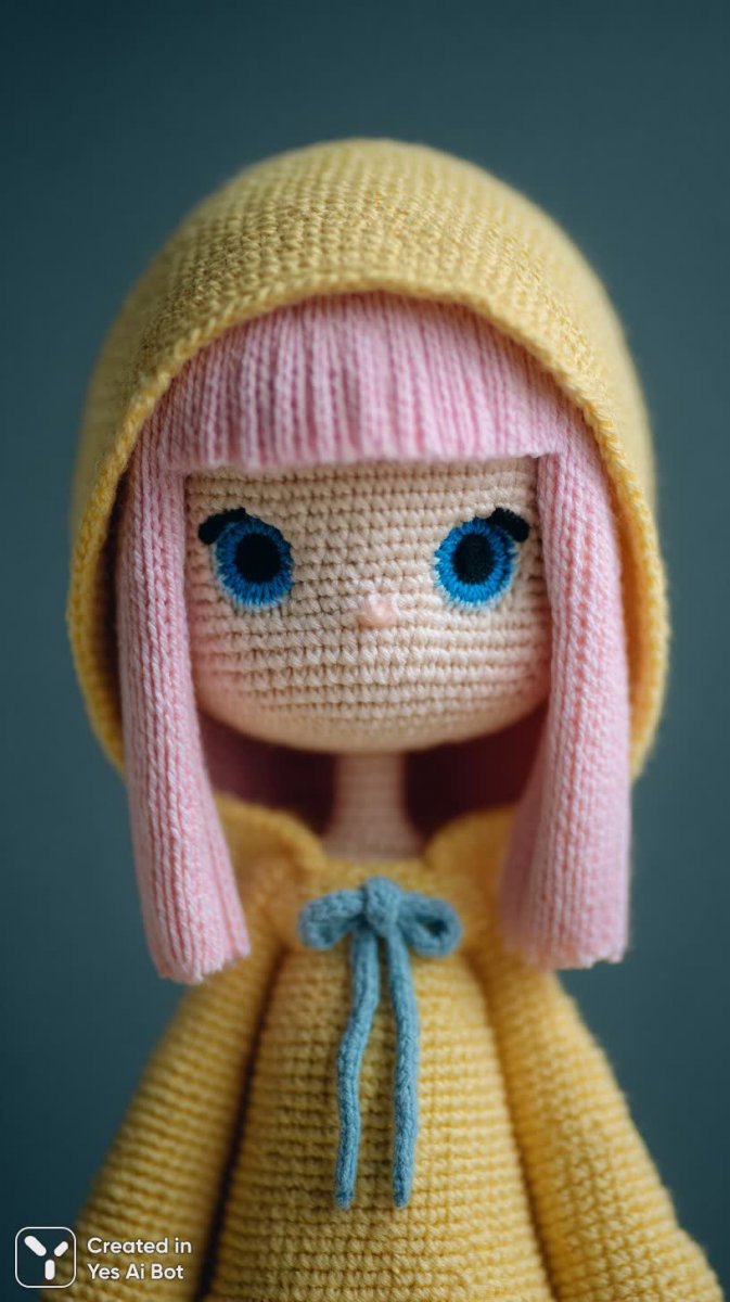 crocheted doll with pink and blue hair, round face, big blue eyes, yellow dress with hood, high-quality, soft lighting.