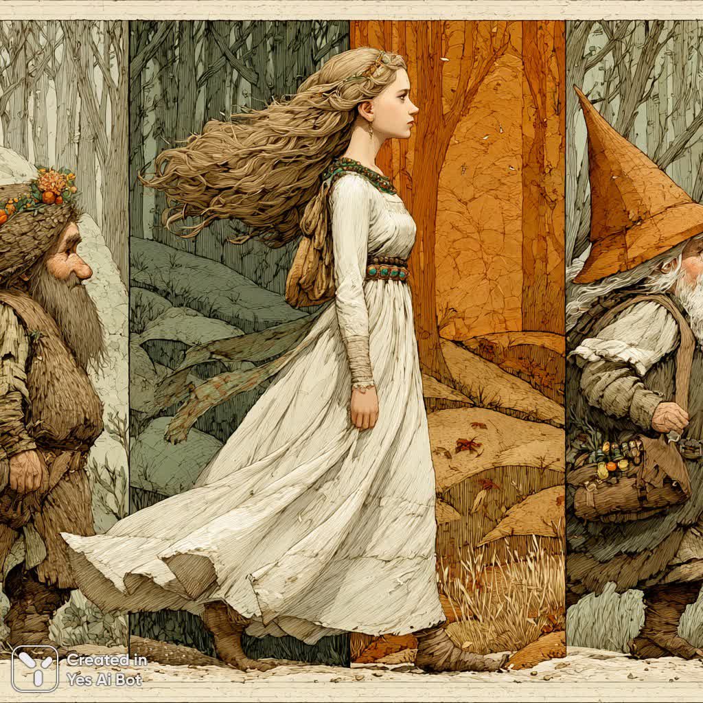 Завораживающая акварельная иллюстрация повествует о путешествии молодой женщины с длинными ниспадающими золотыми волосами, облаченной в простое белоснежное платье. Она уверенно шагает сквозь густой лес, сопровождаемая двумя величественными троллями. Один из них украшен массивным ожерельем из разноцветных бус и драгоценностей, а на голове другого красуется коническая шляпа – оба существа следуют за девушкой, разделяя с ней общий путь. Выражение лица женщины спокойное и торжественное, она нежно сжимает руки перед собой, словно в молитве или размышлении. Передний план картины представляет собой песчаную местность с округлыми холмами и высокими стройными деревьями, создающими живописный фон. Цветовая гамма приглушенная, преобладают оттенки серого, коричневого и кремового, что создает ощущение умиротворения и спокойствия. Мягкое рассеянное освещение окутывает сцену, придавая ей сказочную атмосферу, словно сошедшую со страниц старинной легенды. Работа отсылает к скандинавской иллюстрации начала XX века, отличающейся акцентом на графические линии и упрощенные формы. Вся композиция пронизана темами путешествия, дружбы и таинственности, приглашая зрителя погрузиться в волшебный мир фантазии и размышлений о вечных ценностях. Иллюстрация вызывает чувство благоговения и заставляет задуматься о скрытых силах природы и взаимоотношениях между людьми и мистическими существами