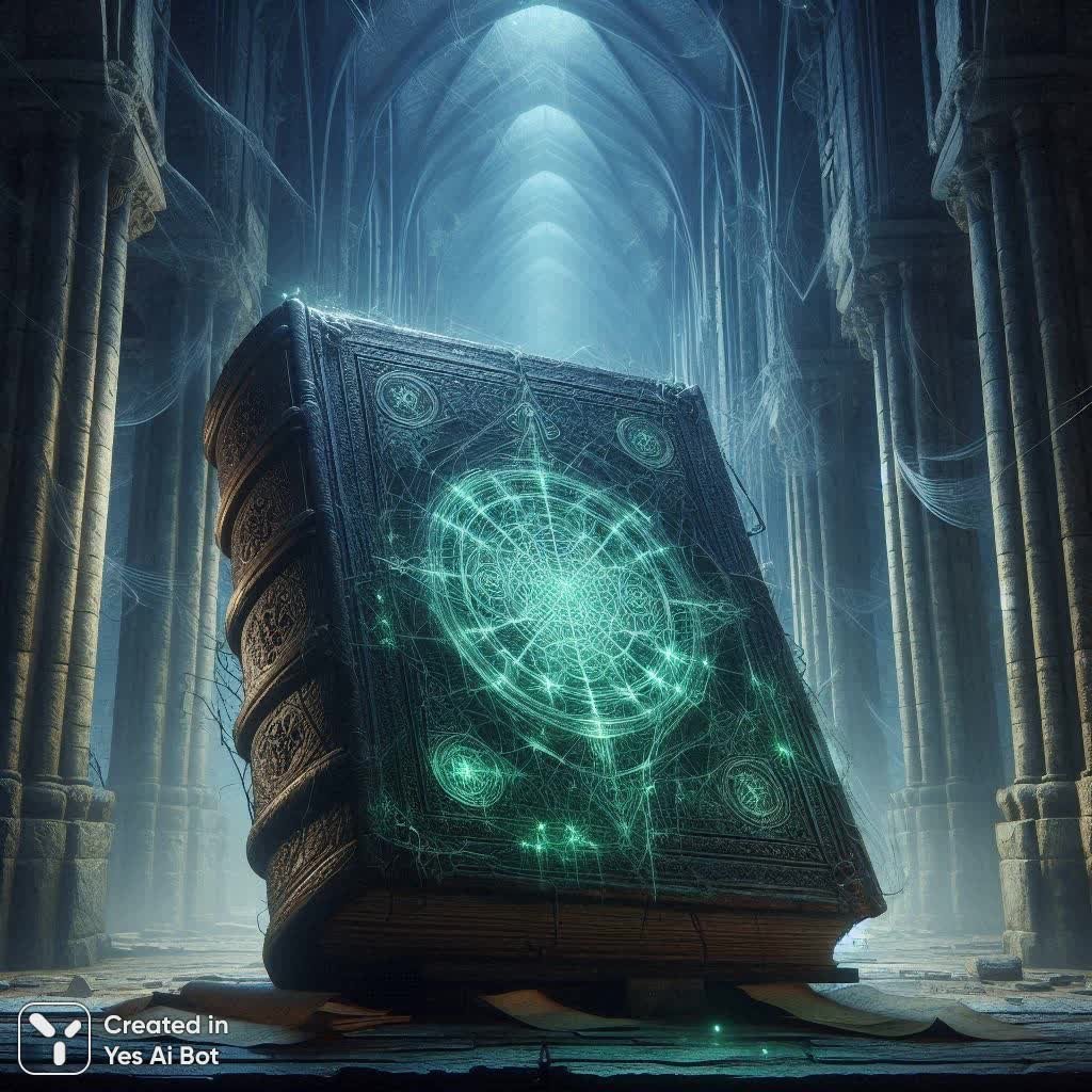 На изображении, созданном нейросетью, представлена старинная книга, парящая над лекционным столом в величественной библиотеке. Книга выполнена в темных тонах: обложка из тёмного дуба и потрескавшейся кожи украшена пульсирующими изумрудными рунами, которые отбрасывают жуткие блики на каменные полки. Страницы книги самостоятельно перелистываются, демонстрируя пергамент, заполненный сложными, меняющимися геометрическими схемами, напоминающими живые чернила. Библиотека поражает своими масштабами: паутинные арки возвышаются под потолком, а в лучах приглушенного кобальтового света танцуют пылинки, проникающие сквозь витражи. Камера снимает снизу вверх, акцентируя внимание на книге и создавая контраст между текстурой старого дерева и блеском пергамента. Рядом со книгой кружит моль с биолюминесцентными зелеными краями, единственное живое существо в этой таинственной атмосфере. Стиль изображения полуреалистичный, с глубокими светотеневыми переходами, а цветовая палитра выдержана в лесных зеленых оттенках, состаренной бронзе и пепельно-голубом цвете сумерек, создавая ощущение древней магии, скрытых знаний и загадочной атмосферы. Книга предстает как портал в мир тайн и секретов, хранящий в себе мудрость веков.