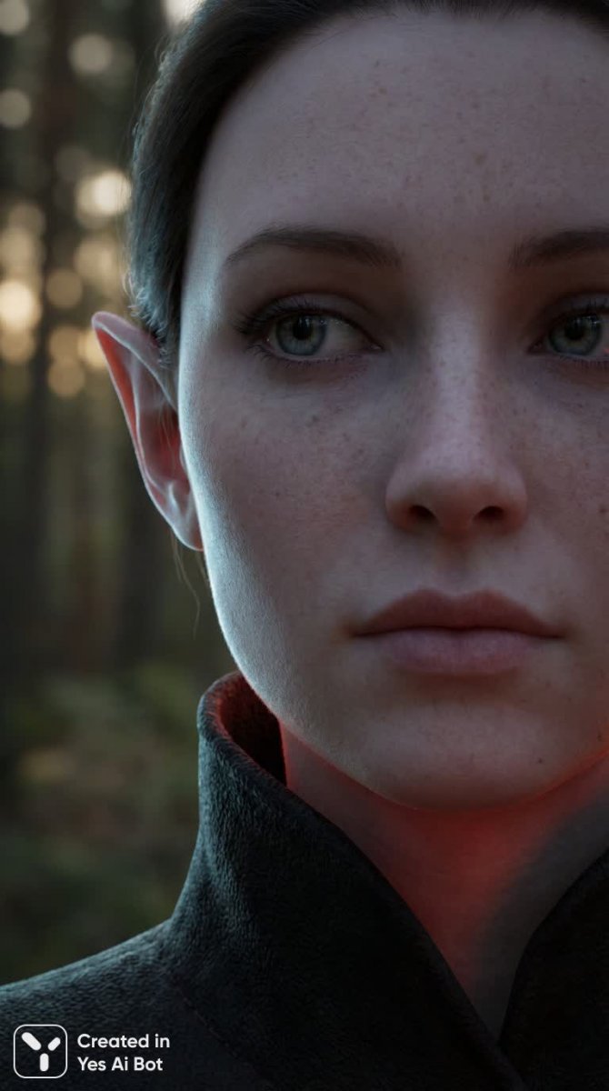 Завораживающий портрет эльфийки, запечатлевший мельчайшие детали ее лица в экстремально крупном плане. В центре внимания – глаза, выражающие сложную гамму чувств: нейтральность, оттененная легкой печалью и интригующей загадочностью. Медленное моргание век и едва заметное смещение взгляда создают ощущение задумчивости и внутренней сосредоточенности. Мягкий контурный свет подчеркивает изящные заостренные уши и нежную бледность кожи, добавляя образу хрупкости и утонченности. Теплое красноватое свечение, исходящее от ее спины, отражается на шее и линии челюсти, создавая эффектное визуальное наполнение. Использование малой глубины резкости и размытый фон в виде леса усиливают атмосферу таинственности и интимной близости. Картина пронизана эмоциональной силой, передает ощущение глубокой внутренней жизни героини. Фотореалистичная детализация и кинематографическое освещение придают изображению невероятную реалистичность и эффект присутствия, погружая зрителя в мир эльфийской красоты и загадок. Этот кадр – настоящее произведение искусства, демонстрирующее мастерство фотографа и его умение передать тончайшие нюансы человеческих эмоций через визуальные образы, создавая неповторимую атмосферу волшебства и мистики