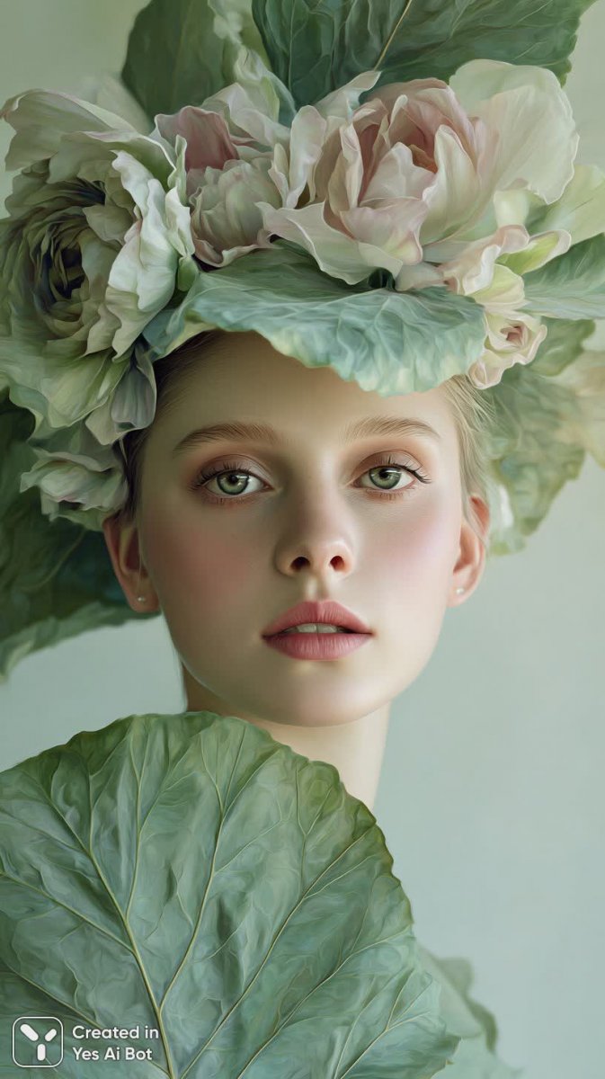 female portrait with soft pastel palette, large green leaves around face, whimsical floral headpiece, dreamy light, surreal realism, minimalistic approach, focus on facial expression and floral elements.