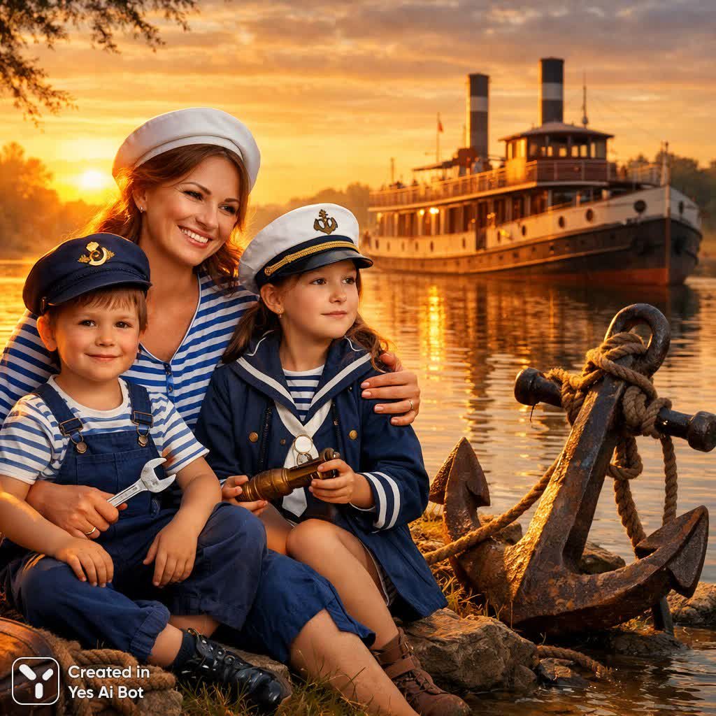 Сцена изображает семейную идиллию на берегу реки, где мать с детьми, одетыми в форму будущих моряков, символизирует преемственность поколений в морском деле. За ними простирается речной флот, а вдалеке виднеется старинный корабль, олицетворяющий историю водных путешествий. Спокойная водная гладь отражает мягкий свет рассвета или заката, создавая атмосферу тепла и вдохновения. Мощный якорь удерживает прошлое, связывая его с будущим поколением моряков, символизируя стабильность и незыблемость традиций. Картина передает глубокую связь между поколениями, подчеркивая важность семьи, упорного труда и веры в светлое будущее, основанное на сохранении морских ремесел и освоении водной стихии. Вся сцена пронизана атмосферой уюта, надежды и мечты о сильных и умелых моряках, готовых покорять водные просторы и бережно хранить наследие предков. Изображение создано искусственным интеллектом Sora Images в стиле Shining.