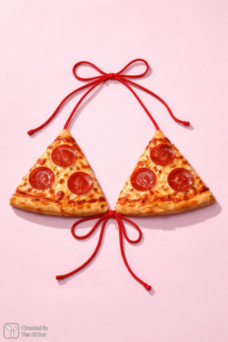 Яркий и забавный сюрреалистичный снимок демонстрирует два треугольных ломтика пиццы с пепперони, искусно оформленных в виде верха бикини. Хрустящая корочка и аппетитная начинка создают неожиданное сочетание с игривым дизайном купальника, подчеркнутым тонкими красными нитями-завязками. Нежный пастельно-розовый фон добавляет легкости и воздушности всей композиции, усиливая ощущение причудливости и беззаботности. Высокая детализация изображения позволяет рассмотреть каждую мелочь: аппетитный вид пепперони, текстуру теста и деликатные переплетения нитей. Этот необычный визуальный образ сочетает в себе кулинарное удовольствие и игривое настроение, представляя собой остроумную и оригинальную работу, которая заставляет улыбнуться и задуматься о неожиданных связях между привычными вещами. Снимок излучает позитив и креативность, превращая обычную пиццу в предмет моды и искусства, вызывая ассоциации с летним отдыхом и безграничной фантазией. Идеально подходит для тех, кто ценит юмор и нестандартные решения в визуальном искусстве, отражая легкость и радость жизни через необычный взгляд на повседневные объекты