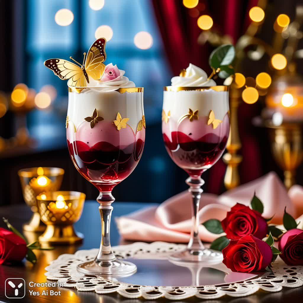 Изысканный десертный коктейль в высоком хрустальном бокале – воплощение роскоши и уюта зимнего вечера. Слоистый напиток завораживает сочетанием глубокого винного оттенка внизу и нежного розового мусса или крема наверху, создавая визуальный шедевр. Бокал украшен филигранной золотой резьбой с мотивами листьев, добавляющей элегантности и изысканности. Венчают композицию воздушный взбитый крем, крошечный бутон розы и две грациозные золотые бабочки, напоминающие драгоценности. На белоснежной кружевной салфетке бокал покоится на столе, рядом уютно мерцает розовая свеча в прозрачном подсвечнике, а вокруг раскинулись темно-красные розы. Мрачный ночной фон оживает множеством теплых золотистых бликов от городских фонарей или гирлянд – завораживающая игра света и тени (боке). Картина поражает своей четкостью и высоким контрастом, передавая атмосферу тепла, богатства и умиротворения, свойственную зимнему вечеру. Это не просто коктейль, это произведение искусства, способное подарить ощущение праздника и роскоши. Идеальный акцент для особого момента или романтического вечера. Насладитесь визуальным великолепием этого напитка, который словно сошел со страниц сказки о волшебстве и изысканном вкусе