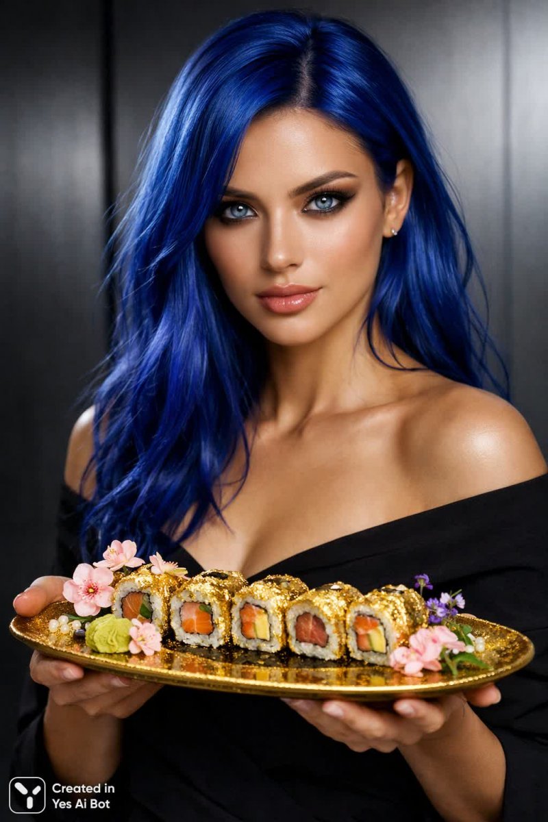 4. radiant model with electric blue hair, holding a shimmering platter of gold-dusted sushi rolls, beautifully plated with delicate flowers, intense gaze captivating the viewer against a sleek, minimalist backdrop.