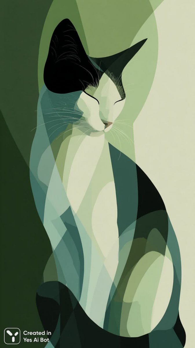 Изящное воплощение кошачьей грации в мире абстрактного искусства. Черно-белый кот, выполненный в минималистичном стиле, становится центральным элементом композиции на мягком зеленом фоне. Картина дышит спокойствием и умиротворением благодаря использованию геометрических форм и нежных пастельных тонов, создающих ощущение воздушности и легкости. Замкнутые глаза и настороженные ушки кота передают момент безмятежного отдыха, полного доверия и расслабленности. Современное векторное искусство позволяет добиться четкости линий и плавных переходов цвета, придавая работе особую изысканность. Это не просто изображение животного – это визуальная поэма о красоте простых вещей, где каждая деталь продумана до мелочей. Использование формата png гарантирует высокое качество изображения и возможность его легкой интеграции в различные цифровые проекты. Картина станет прекрасным украшением для интерьера, стильным акцентом на сайте или оригинальным подарком для любителей кошек и современного искусства. Она способна наполнить пространство гармонией и позитивными эмоциями, привнося нотку элегантности и утонченности в любой дизайн. Сочетание минимализма и живописности создает неповторимый эффект, делая эту работу поистине уникальной и запоминающейся