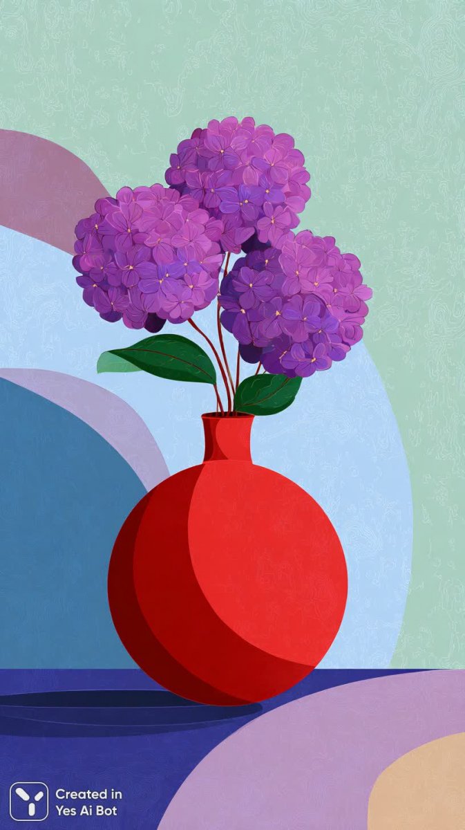 minimalistic illustration of a red round vase, filled with purple and pink flowers, arranged for depth, background of gradient colors including pastel green and blue, featuring geometric patterns in soft curves, abstract painting, vector art, png.