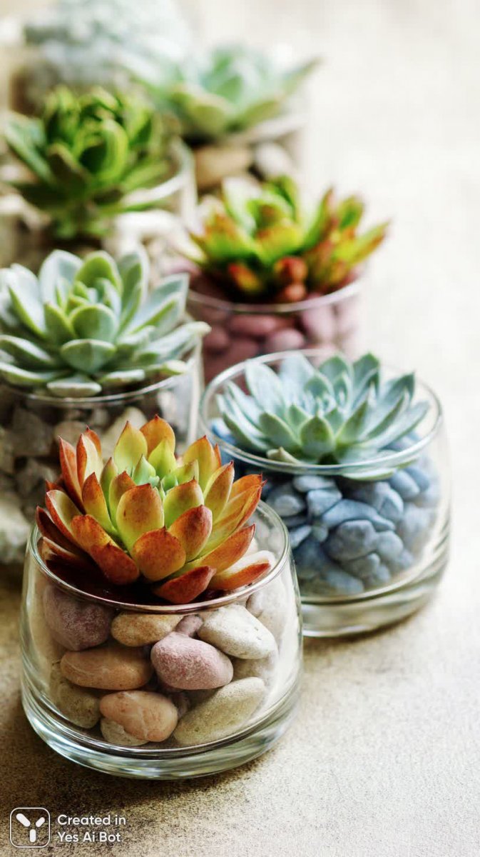 layered arrangement of various succulents in glass pots filled with colored stones, artistic close-up, warm wooden table, natural light, minimalist decor style, focus on plant details.