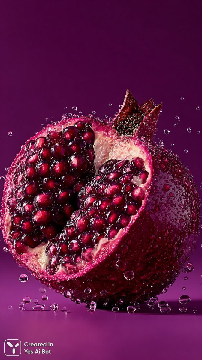 midjourney Сочные зерна граната, капли воды, макросъемка, насыщенный фиолетовый фон, яркие цвета и захватывающие текстуры. Картинка из нейросети Midjourney