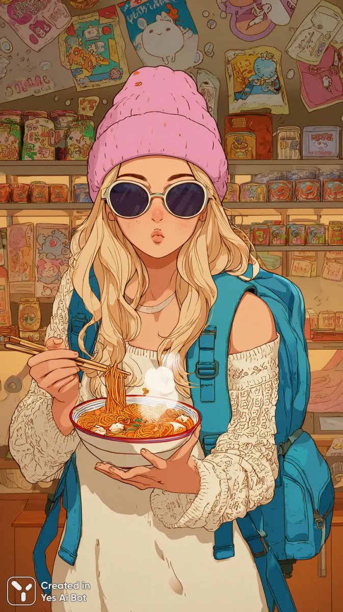 Молодая женщина в розовой шапочке, с длинными светлыми волосами, одетая в белую вязаную кофточку и объемные солнцезащитные очки, наслаждается тарелкой рамена, украшенной забавным рисунком пара. На плечах у нее синий рюкзак с нарисованным смеющимся лицом, создающим атмосферу беззаботности и радости. Действие происходит в уютном кафе с теплой обстановкой, которое словно оживает благодаря элементам дополненной реальности и ярким неоновым надписям, напоминающим игривые зарисовки. На заднем плане видны полки, уставленные различными закусками, добавляющие живости и аппетита к происходящему. Стиль изображения выполнен в духе аниме, с акцентом на детализированные продукты питания, делающий сцену визуально привлекательной и вызывающей приятные эмоции. Кажется, что каждый элемент, от шапочки до рисунка на рамене, призван создать ощущение тепла, уюта и позитива, погружая зрителя в мир ярких красок и безмятежного удовольствия. Это идеальное сочетание моды, еды и искусства, создающее запоминающийся и вдохновляющий образ