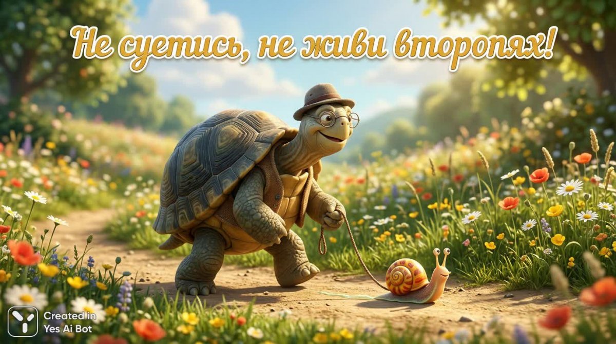 На залитом солнцем лугу медленно прогуливается большая черепаха, ведя за собой маленькую улитку на поводке. Яркая надпись 'Не суетись, не живи второпях!' напоминает о ценности спокойствия и размеренного темпа жизни. Размытый фон, состоящий из зелёной травы и разноцветных цветов, создаёт атмосферу лёгкости и умиротворения. Картина выполнена в стиле Pixar с использованием мягкого освещения и тёплых тонов, что придаёт ей волшебный и сказочный вид, вызывая ощущение радости и позитива. Это дружелюбное изображение акцентирует внимание на простых вещах и необходимости ценить каждый момент, побуждая к осознанности и поиску гармонии с окружающим миром. Изображение создано нейросетью Nano Banana v.1.0 Pro, используя промт, описывающий тёплый солнечный день, черепаху, улитку, надпись на русском языке, размытый фон и стиль Pixar в 3D с яркими цветами и мягким освещением для создания дружелюбной атмосферы.