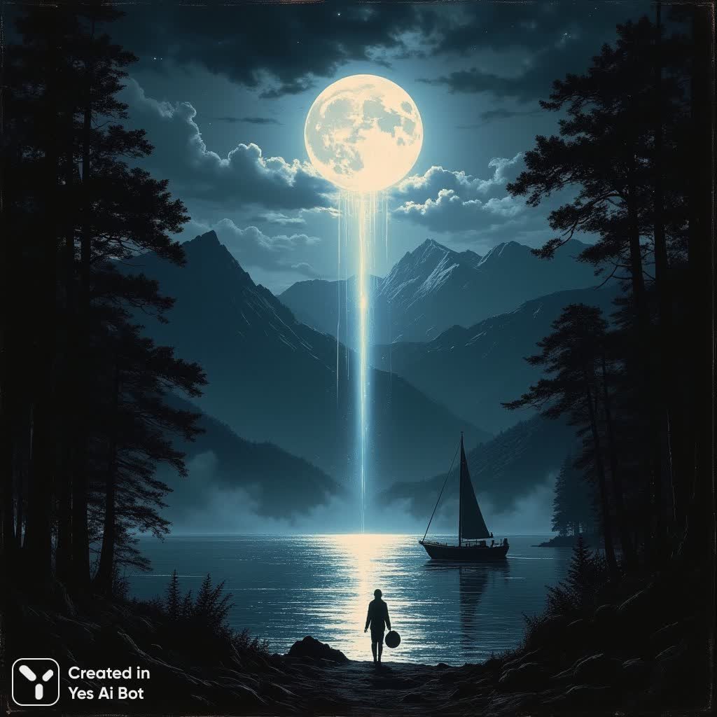 Завораживающая ноктюрная картина представляет собой лунный пейзаж, погруженный в тишину и умиротворение. В центре внимания – огромная полная луна, щедро одаривающая своим серебристым светом окрестности. Свет луны отражается в спокойной водной глади, образуя яркую вертикальную полосу света, которая словно разделяет мир на светлое и темное. На озере покачивается небольшая парусная лодка, ее силуэт четко выделяется на фоне ослепительной водной поверхности. В переднем плане одинокая фигура, кажущаяся крошечной по сравнению с величием природы, неспешно прогуливается вдоль берега, держа в руках какой-то сверток – возможно, символ надежды или таинственного бремени. Темные деревья и густая растительность обрамляют озеро и берег, создавая ощущение глубины и загадочности, словно скрывая неведомые тайны. Вдали величественно возвышаются горы, их очертания смягчены ночной дымкой, придавая пейзажу неземную красоту. Цветовая гамма картины выдержана в глубоких синих и черных тонах с добавлением серебристых оттенков лунного света. Драматическое освещение создает резкие контрасты между светом и тенью, подчеркивая глубину и объемность изображения. Общее настроение полотна пронизано спокойствием и одиночеством, наполняя зрителя чувством романтики и возвышенного созерцания. Стиль живописи отсылает к эпохе романтизма, с его акцентом на величие и драматизм природных элементов, воспевающих красоту мира в ночной тишине. Картина словно приглашает зрителя погрузиться в мир грез и уединения, ощутить гармонию с природой и испытать чувство благоговения перед ее безграничными возможностями
