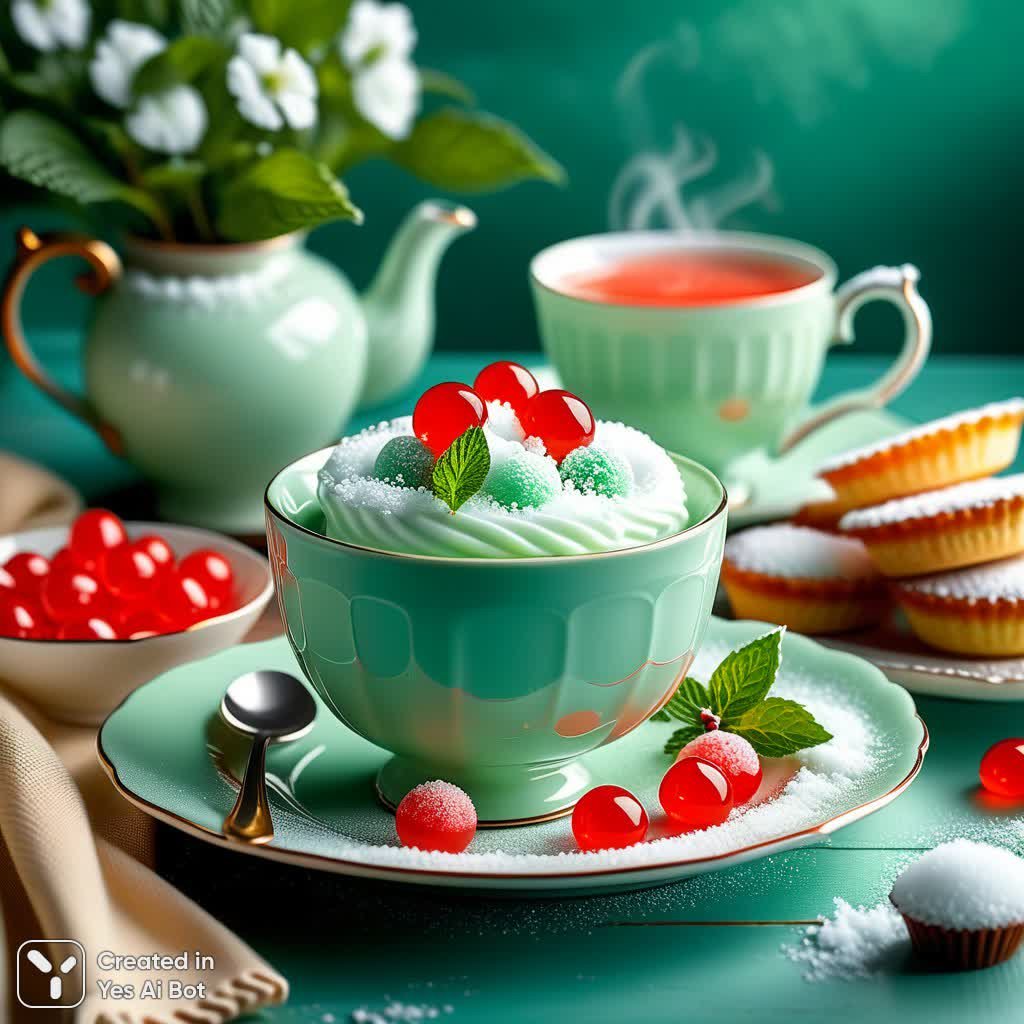 Charming 3D illustration in 'cozy realism' style. Close-up of an appetizing winter treat. A delicate creamy pudding quivers on a vintage green plate. It is sprinkled with 'snow' made of sweet peppermint caramel and decorated with green leaves on top. The composition is complemented by hot tea in a beautiful porcelain cup and a teapot in the background. Cozy, thick steam rises from the tea. The atmosphere is of a fresh frosty morning penetrating into a warm home. The color scheme is fresh and clean: a combination of pastel mint color of the dishes with the bright red color of the candies and the whiteness of the dessert. The image is very sharp, glossy, 'delicious,' with a high level of detail.