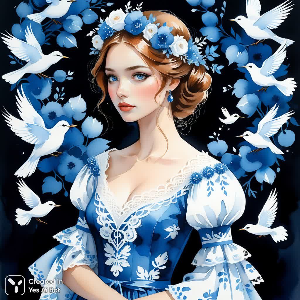 На акварельной картине, выполненной в сочетании с акрилом, изображен женский портрет. Модель запечатлена в случайной позе, с изящными чертами лица, которые подчеркнуты деликатностью исполнения. На голове модели – венок из голубых и белых цветов, создающий эффект легкости. Она одета в платье с узором в стиле Гжель, выполненным в бело-голубой гамме, с замысловатым дизайном рукавов, добавляющим элегантности. Фон картины темный и оживлен стайками маленьких голубых и белых птиц, выполненных в стиле художницы Анки Журавлевой. Композиция пронизана атмосферой мечтательности и романтики, сочетая классическую живопись с современным искусством. Мягкость и прозрачность акварельных техник усиливают привлекательность изображения для ценителей нежного искусства. Вся работа выполнена при помощи нейросети Stable Diffusion на основе модели DreamFusion с использованием Euler a семплера и в стиле ComicBook, созданная алгоритмом ИИ Yes Ai Bot по заданному промту: Watercolor acrylic, random pose of a woman, delicate facial features, blue and white wreath on her head, dress with lace Gzhel painting print, complicated sleeves, black background with flying blue and white small birds in the style of Anka Zhuravleva. Изображение демонстрирует пример работы нейросети, создающей детализированный и стилизованный женский портрет с использованием характерных элементов русской художественной традиции и узнаваемого стиля Анки Журавлевой, что придает произведению уникальность и неповторимость.