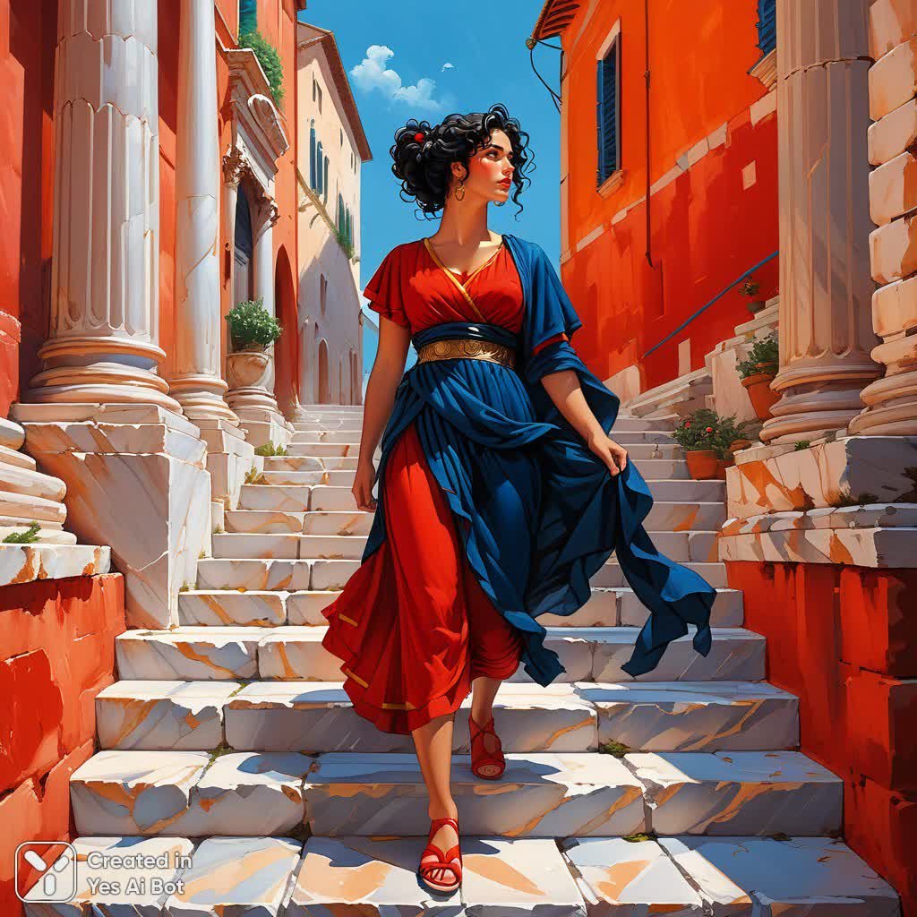 Завораживающая масляная живопись Александра Януты переносит нас в сердце Древнего Рима. На полотне с широкими, небрежными мазками изображена величественная римлянка, гордо стоящая на мраморных ступенях перед алой стеной. Ее роскошные черные кудри собраны в аккуратный пучок, а темно-синий наряд подчеркивает ее достоинство и силу. Внизу, у ее обнаженных ног, лежит римлянин с закрытыми глазами, словно погруженный в глубокий сон или отрешенность от мирской суеты. Композиция пронизана ощущением власти и спокойствия, контрастирующего с драматизмом ситуации. Картина создает атмосферу загадочности, заставляя зрителя задуматься о взаимоотношениях между этими двумя персонажами и о тайнах, скрытых в глубине древней римской цивилизации. Мастерское владение техникой живописи позволяет художнику передать не только внешние черты героев, но и их внутреннее состояние, наполняя полотно глубоким эмоциональным содержанием. Яркие цвета и динамичные мазки создают эффект присутствия, словно зритель становится свидетелем этой сцены, разворачивающейся на фоне величественных римских руин. Работа Януты – это не просто изображение исторических персонажей, а проникновенное исследование человеческой природы и вечных тем власти, любви и судьбы. Картина поражает своей экспрессивностью и создает незабываемое впечатление, оставляя после себя долгое послевкусие размышлений о величии и трагедии Древнего Рима