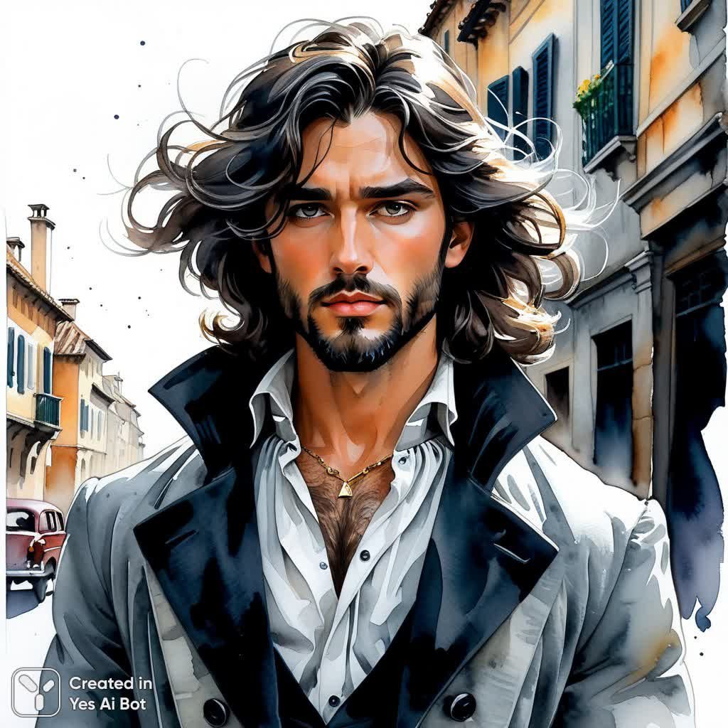Завораживающая акварельно-акриловая работа представляет собой спонтанный портрет мужчины с длинными темными волосами и небольшой бородой, трепещущей на ветру. Его взгляд устремлен вдаль с глубокой сосредоточенностью, а одежда, словно сошедшая со старинной картины, создает ощущение погружения в прошлое. Визуальный образ отсылает к мастерству живописи эпохи барокко, где акцент сделан на выразительных монохромных тонах и резком контрасте между светом и тенью. Преобладание черного, белого и различных оттенков серого формирует строгую, но в то же время романтическую атмосферу произведения. Чувствуется утонченность и сдержанность в каждом мазке, передавая ощущение тайны и благородства. Фигура мужчины, облаченная в свободную рубашку и фактурный сюртук с высоким воротником, кажется воплощением элегантности и внутренней силы. Вся композиция пронизана меланхоличной красотой и вызывает чувство восхищения перед искусством создания портретов, способных запечатлеть не только внешнее сходство, но и глубину человеческой души. Это произведение – настоящее путешествие во времени, позволяющее ощутить дух ушедшей эпохи и прикоснуться к вечным ценностям прекрасного