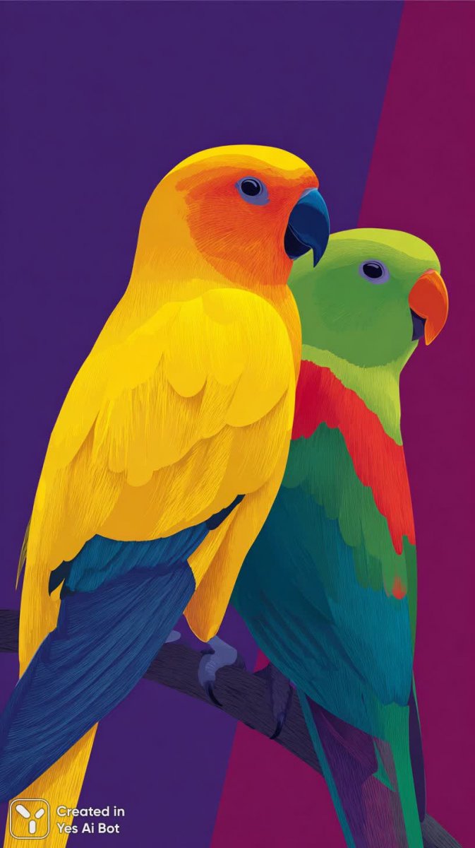 two vibrant parrots, one yellow with blue feathers and one green with red accents, perched together, contrasting backgrounds of purple and teal, pop art illustration, modern graphic style.