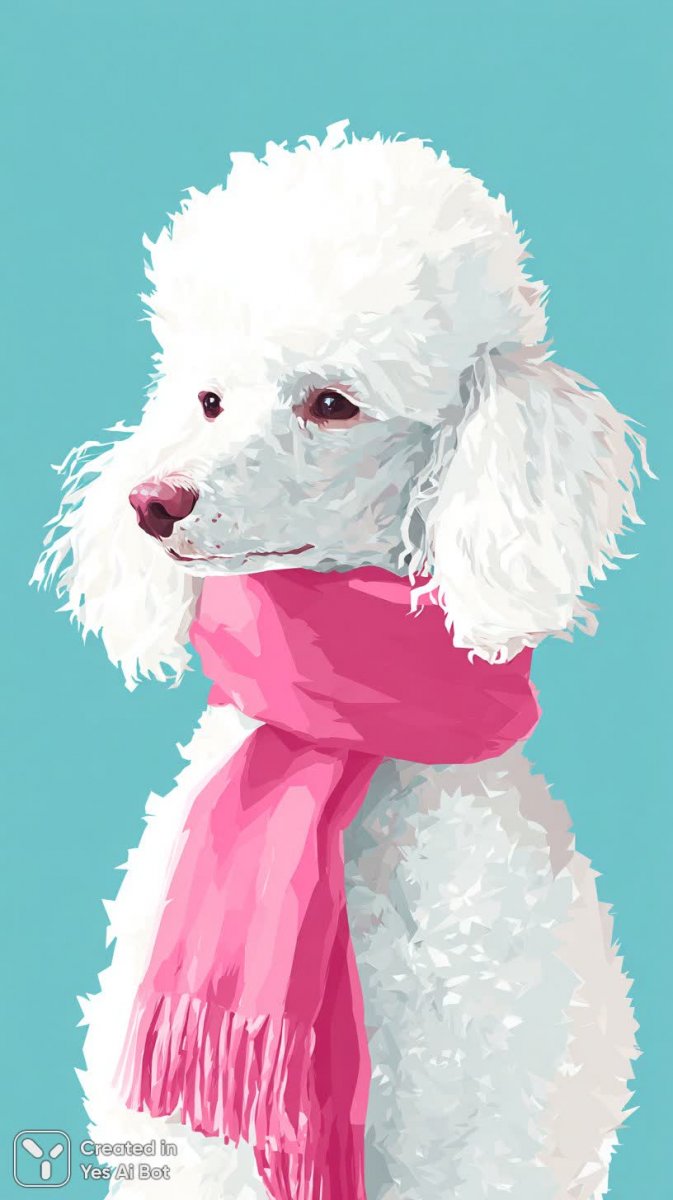 white poodle, vibrant pink scarf, stylized illustration, geometric patterns on fur, minimalistic solid turquoise BG, soft lighting, playful gaze, modern graphic style.