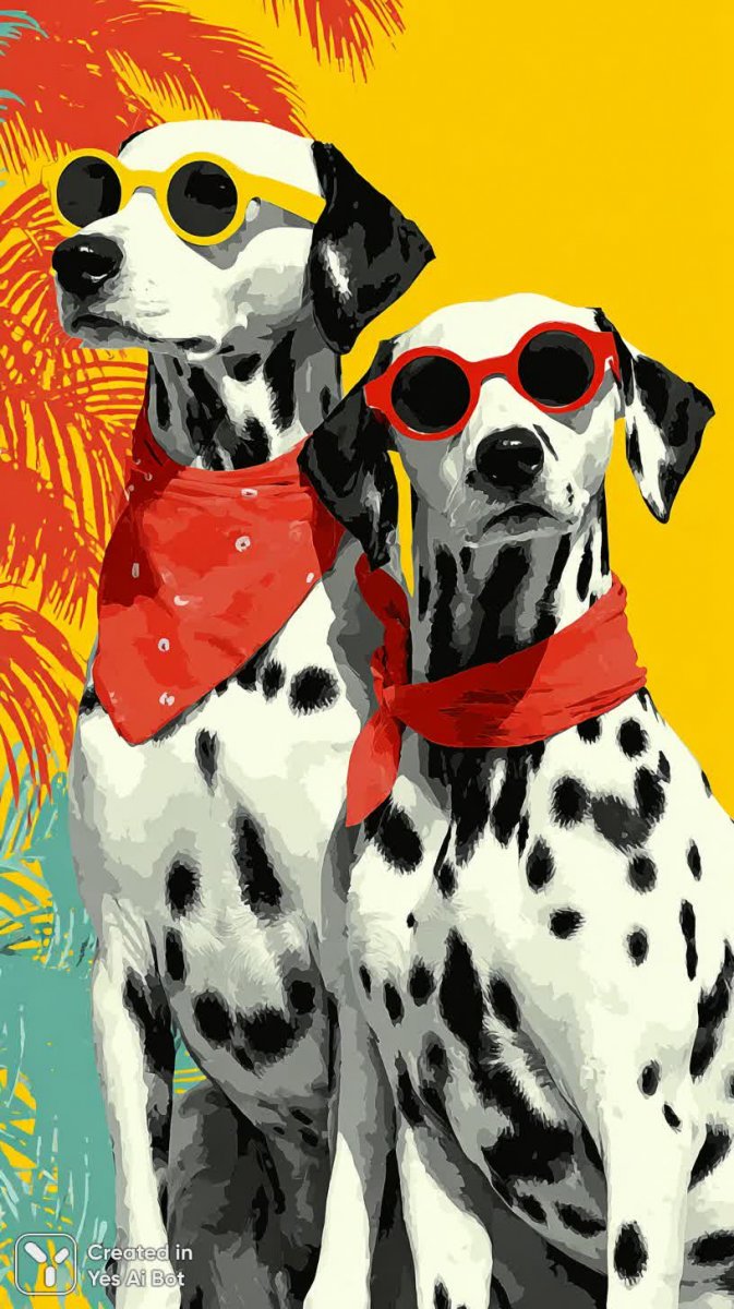 Далмацианская парочка в стиле поп-арт: яркие краски тропиков и необычные узоры на шерсти - Картинка из нейросети Миджорни