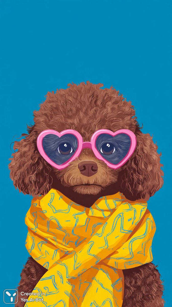 fluffy brown dog wearing pink heart-shaped glasses, yellow scarf with abstract patterns, vibrant blue BG, portrait, minimalist illustration, bright colors, stylish accessories.