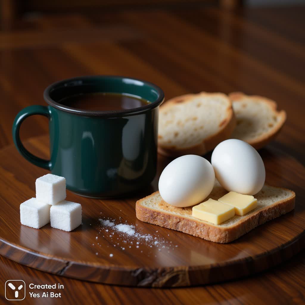 На столе из полированного темного дерева воссоздана утренняя картина завтрака, простая и располагающая к себе. В левой части композиции выделяется глубокий изумрудно-зеленый эмалированный стакан с черной окантовкой и ручкой, наполненный насыщенным коричневым напитком – возможно, крепким кофе или ароматным какао. Рядом со стаканом аккуратно сложены два белоснежных кубика сахара, создающие ощущение сладости и нежности. Справа от стакана расположились два сваренных вкрутую яйца, элегантно покоящиеся на небольшой ломтике хлеба. Между яйцами размещены небольшие кусочки сливочного масла, обладающего слегка шероховатой текстурой, намекающей на его богатый и кремовый вкус. Хлеб имеет аппетитный золотистый оттенок, контрастирующий с белизной яиц и мягкостью масла. Фон выполнен в теплых коричневых тонах, отражающих структуру деревянной поверхности стола, создавая ощущение уюта и тепла. Мягкое и естественное освещение подчеркивает насыщенность цветов и фактур каждого элемента, делая сцену особенно реалистичной и привлекательной. Вся композиция отличается гармоничностью и сбалансированностью, акцентируя внимание на обыденных предметах быта и создавая атмосферу спокойствия и безмятежности, напоминающую о тихом сельском завтраке в окружении близких людей. Это изображение – воплощение простоты, комфорта и маленьких радостей повседневной жизни, вызывающее чувство умиротворения и приятного аппетита