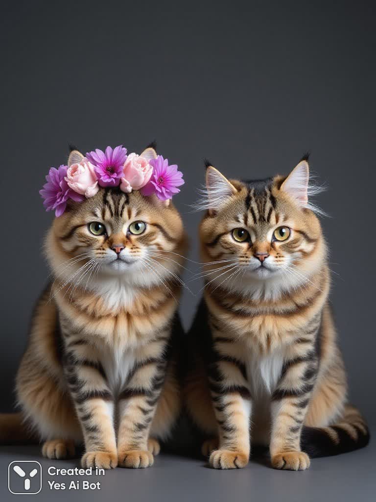 Два пушистых кота, расположенных рядом друг с другом, создают очаровательное и слегка комичное изображение. Кот слева украшен цветочной короной, в которой преобладают нежные розовые и лиловые оттенки, добавляя образу сказочности и игривости. Его шерсть представляет собой гармоничное сочетание коричневого, серого и белого цветов, формируя привлекательный полосатый узор, который притягивает взгляд и подчеркивает текстуру меха. Кот справа обладает схожим окрасом, однако с чуть более теплыми оттенками коричневого и серого, что создает ощущение мягкости и уюта. Несмотря на общую красоту композиции, выражение мордочек обоих котов вызывает легкую улыбку – они выглядят немного раздраженными, что добавляет изображению юмора и узнаваемости. Этот контраст между милым внешним видом и слегка недовольным выражением лиц делает фотографию идеальной для создания мемов или публикации в социальных сетях, где она обязательно вызовет положительные эмоции и заставит зрителей улыбнуться. Фон выполнен в нейтральных темных тонах – темно-сером или черном, что позволяет котам стать главным акцентом изображения и не отвлекает внимание от их очаровательных мордашек. Прямой фронтальный ракурс делает изображение максимально четким и выразительным, а ровное освещение подчеркивает детали шерсти и цветочной короны. В целом, это прекрасное фото для любителей кошек и юмора, которое идеально подойдет для добавления позитива в повседневную жизнь