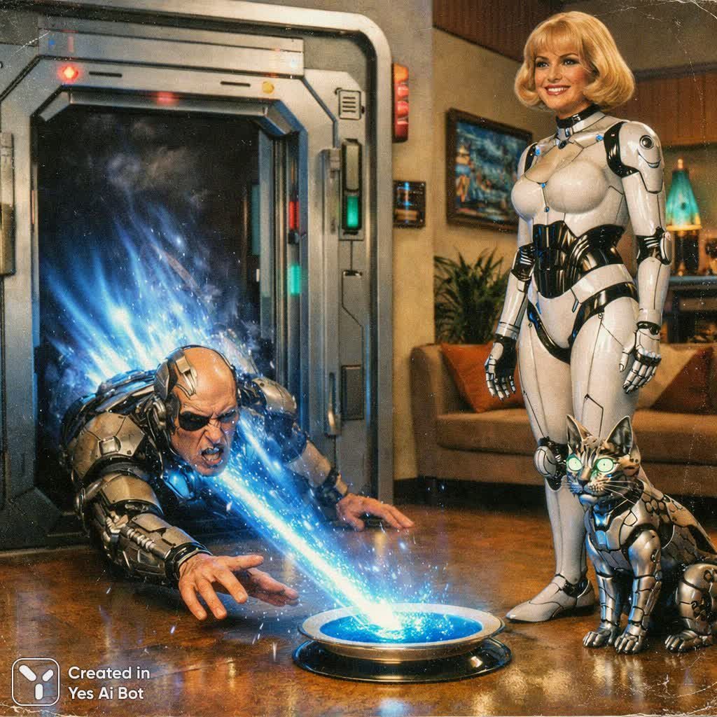 Сцена в стиле футуристического ситкома, снятая как будто на старую пленку. Техно-дверь открывается, и из нее ползет киборг-мужчина, притягиваемый силовым полем к блюдцу со светящейся синей жидкостью. Женщина-андроид с механической кошкой наблюдает с доброжелательной, но запрограммированной улыбкой.