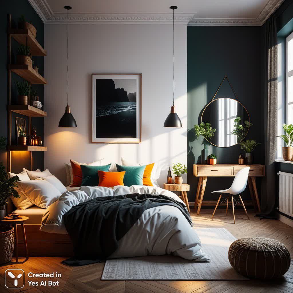 Светлая спальня в скандинавско-бохо стиле демонстрирует гармоничное сочетание природной красоты и современного минимализма. Пространство наполнено естественным освещением, подчеркивающим чистоту белых стен и мягкость текстиля. Натуральная деревянная мебель создает ощущение тепла и уюта, а акцентный элемент – неоновый пустой белый фрейм на стене – добавляет нотку современного искусства и загадочности. Фотореалистичная детализация интерьера позволяет полностью погрузиться в атмосферу спокойствия и релаксации. Дизайн пронизан легкостью и воздушностью, характерными для скандинавского стиля, при этом богемные акценты придают помещению индивидуальность и неповторимость. Этот уголок представляет собой идеальное место для отдыха и восстановления сил, где каждая деталь тщательно продумана для создания максимально комфортной обстановки. Просторный интерьер располагает к умиротворению и вдохновению, а нейтральная цветовая палитра способствует расслаблению и снятию стресса. Комната словно дышит свежестью и чистотой, предлагая убежище от городской суеты. Использование натуральных материалов подчеркивает экологичность и заботу об окружающей среде. Неоновый элемент на стене служит холстом для воображения, приглашая к творчеству и самовыражению. Общий стиль интерьера создает ощущение гармонии и баланса, где функциональность сочетается с эстетикой. Эта спальня – воплощение современного комфорта и природной красоты, созданное для тех, кто ценит простоту, элегантность и индивидуальный стиль