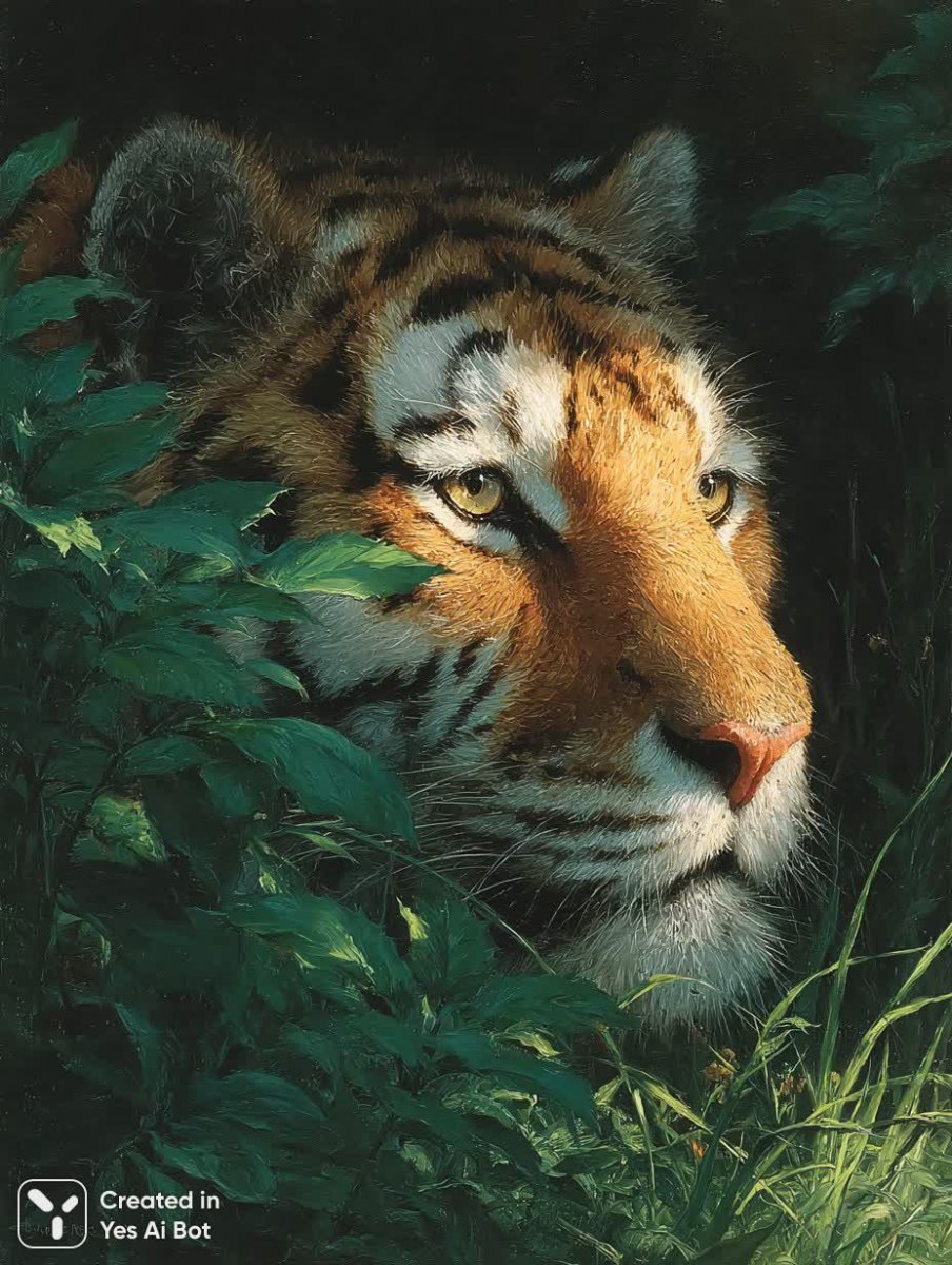 Мощный бенгальский тигр выходит из густой тени, запечатленный в масляной живописи с поразительной реалистичностью. Часть морды хищника освещена теплым светом, подчеркивая роскошную золотистую шерсть и четкие черные полосы – характерный узор бенгальской кошки. Взгляд тигра направлен прямо на зрителя, пронизывающий и интенсивный, а розоватый нос и слегка приоткрытый расслабленный рот добавляют образу живости и реализма. Вокруг величественного зверя простирается буйная растительность: темная зелень листвы и длинная трава создают эффект погружения в дикую природу. Композиция выдержана крупным планом, что позволяет детально рассмотреть текстуру шерсти и листвы. Контраст между светом и тенью невероятно силен, а использование техники кьяроскуро придает картине глубину и драматизм. Темный фон служит идеальным фоном для выделения освещенных участков морды тигра, усиливая его присутствие и внушительность. Работа выполнена в классическом стиле с плавными мазками кисти, создающими ощущение мягкости шерсти и фактурности листвы. В целом картина передает таинственную и слегка напряженную атмосферу, заставляя зрителя почувствовать себя свидетелем скрытой силы природы. Это не просто изображение тигра, это погружение в его мир, наполненное величием и первозданной красотой дикой природы, где каждый оттенок и текстура продуманы до мельчайших деталей, чтобы вызвать сильные эмоции и захватить воображение