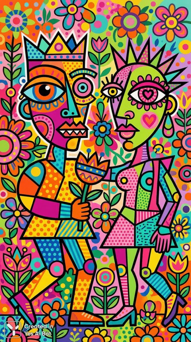 Яркая и динамичная композиция в стиле поп-арт представляет собой два абстрактных образа, выполненные с использованием смелых геометрических форм и необычных лиц. Выразительные глаза, занимающие значительную часть лица, привлекают внимание и передают интенсивность эмоций. Палитра выполнена в насыщенных, жизнерадостных цветах: оранжевый, зеленый и розовый создают ощущение энергии и оптимизма. Декоративные элементы и цветочные мотивы, интегрированные в фон, добавляют изображению визуальный интерес и глубину. Плоская композиция подчеркивает современный художественный подход, а общее настроение произведения пронизано духом современного искусства, сочетая в себе игривость, смелость и оригинальность исполнения. Каждый элемент картины тщательно продуман для достижения максимального визуального воздействия, создавая яркое и запоминающееся впечатление. Использование контрастных цветов и четких линий придает изображению динамизм и современный характер. Это произведение искусства – ода креативности и смелому выражению художественной идеи
