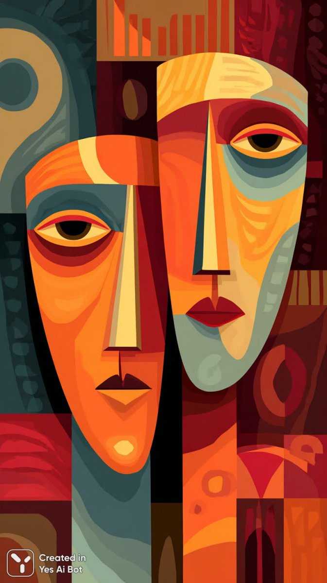 Яркая и динамичная картина в стиле кубизма изображает двух персонажей с абстрактными чертами лица, выполненных в насыщенной цветовой палитре. Смелые линии создают ощущение движения и энергии, а геометрические узоры на заднем фоне усиливают сюрреалистическую атмосферу произведения. Один из фигур выделяется элегантной шляпой, украшенной цветочными мотивами, добавляя композиции нотку игривости и шарма. Художественная иллюстрация демонстрирует мастерское владение формой и цветом, передавая ощущение радости и творчества. Картина представляет собой захватывающее сочетание абстракции и реализма, создавая уникальное визуальное впечатление, полное загадок и вдохновения. Эта работа поражает своей оригинальностью и способностью пробуждать воображение зрителя, приглашая его погрузиться в мир фантазий и неожиданных открытий. Композиция наполнена энергией и позитивом, а яркие цвета создают ощущение праздника и беззаботности. Это произведение искусства — настоящий гимн красоте и творчеству, способный вдохновить каждого, кто смотрит на него