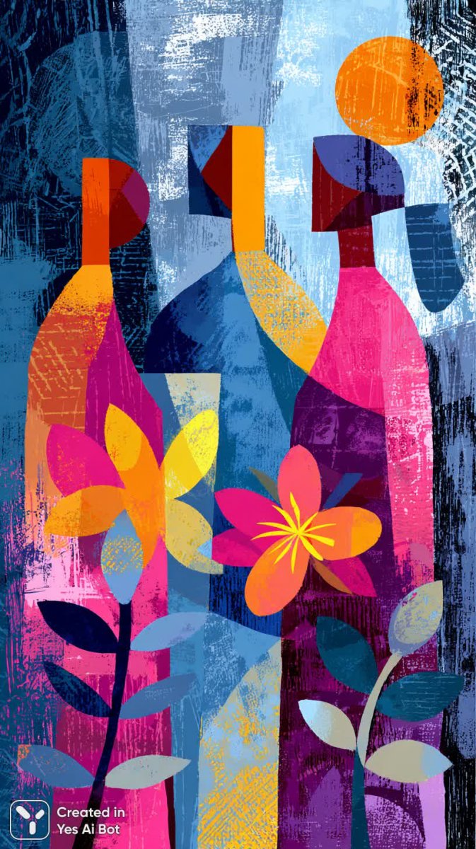 Кубизм и яркие цвета: абстрактные фигуры в современном стиле с цветочными акцентами и геометрией - Пример изображения, созданного ИИ Midjourney