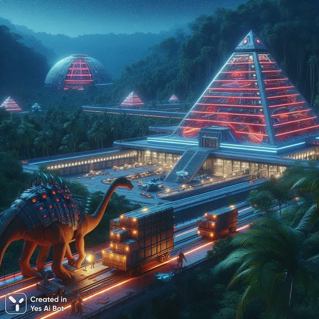 Затерянный в сердце непроходимых джунглей, этот космопорт поражает воображение своим необычным обликом. Мощное сооружение, напоминающее древний майянский храм-пирамиду, возвышается над окружающей зеленью, а его стены мерцают таинственным светом красных и белых неоновых панелей. Рядом с посадочной площадкой, готовыми к отлету, стоят два космических корабля: один – идеально сферический, словно вырезанный из цельного куска металла, другой – вытянутый, в форме элегантной капли, напоминающей древний артефакт. Активная погрузка грузов на один из кораблей происходит с помощью массивной тележки, запряженной невероятным существом. Это нечто среднее между динозавром и экзотическим животным – грациозное создание с мощными лапами и украшенной гребнем спиной, а также внушительным рогом на носу. За необычной парой следует человек в длинных, развевающихся одеждах, вероятно, осуществляющий контроль за процессом погрузки. Вокруг космопорта простирается буйная тропическая растительность – высокие деревья с переплетенными лианами образуют непроходимый полог над головой. Ночь окутала джунгли своим бархатным покрывалом, а в небе ярко сияет огромная красная луна, придавая пейзажу мистический и немного зловещий оттенок. Вся картина словно соткана из фантазий о древних цивилизациях и космических путешествиях, где прошлое переплетается с будущим в удивительной гармонии. Этот космопорт – не просто точка отправления в далекие звездные системы, это портал в мир невероятных возможностей и неизведанных тайн, скрытых в глубинах джунглей