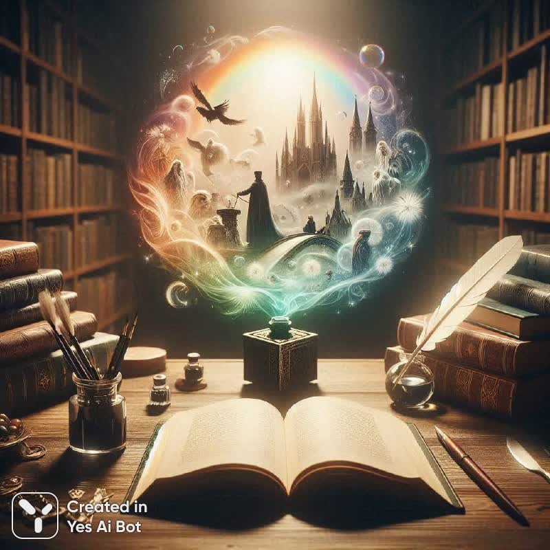 В полумраке кабинета, где время словно застыло, разворачивается сцена вдохновения и творчества. На столе, словно приглашение к путешествию по страницам знаний, лежит раскрытая книга – портал в мир историй и фантазий. Рядом с ней, словно верные спутники, покоятся письменный прибор, чернильница с бархатным наполнением и изящное перо, готовые запечатлеть рождающиеся мысли. С обеих сторон кабинета высятся величественные стеллажи, уставленные книгами – безмолвными хранителями мудрости поколений. Но самое удивительное происходит над раскрытой книгой: там возникает неземной радужный ореол, словно свет из другого мира проникает в реальность. В этом сияющем вихре разворачиваются сцены из сказок и легенд – фигуры людей, полные надежд и мечтаний; величественный замок, возвышающийся над землей, символ силы и защиты; бесстрашный всадник, гордо восседающий на коне, олицетворение мужества и стремления к новым горизонтам. Эта картина – не просто изображение предметов, это метафора творческого процесса, когда идеи рождаются из соприкосновения с книгой, а воображение создает миры, полные волшебства и приключений. Здесь сплетается реальность и фантазия, прошлое и будущее, знания и мечты, создавая атмосферу таинственности и вдохновения, которая побуждает к познанию и самовыражению. Это место, где рождаются истории, оживают легенды и воплощаются в жизнь самые смелые замыслы. Кажется, будто сама атмосфера кабинета дышит творчеством и приглашает окунуться в мир безграничных возможностей