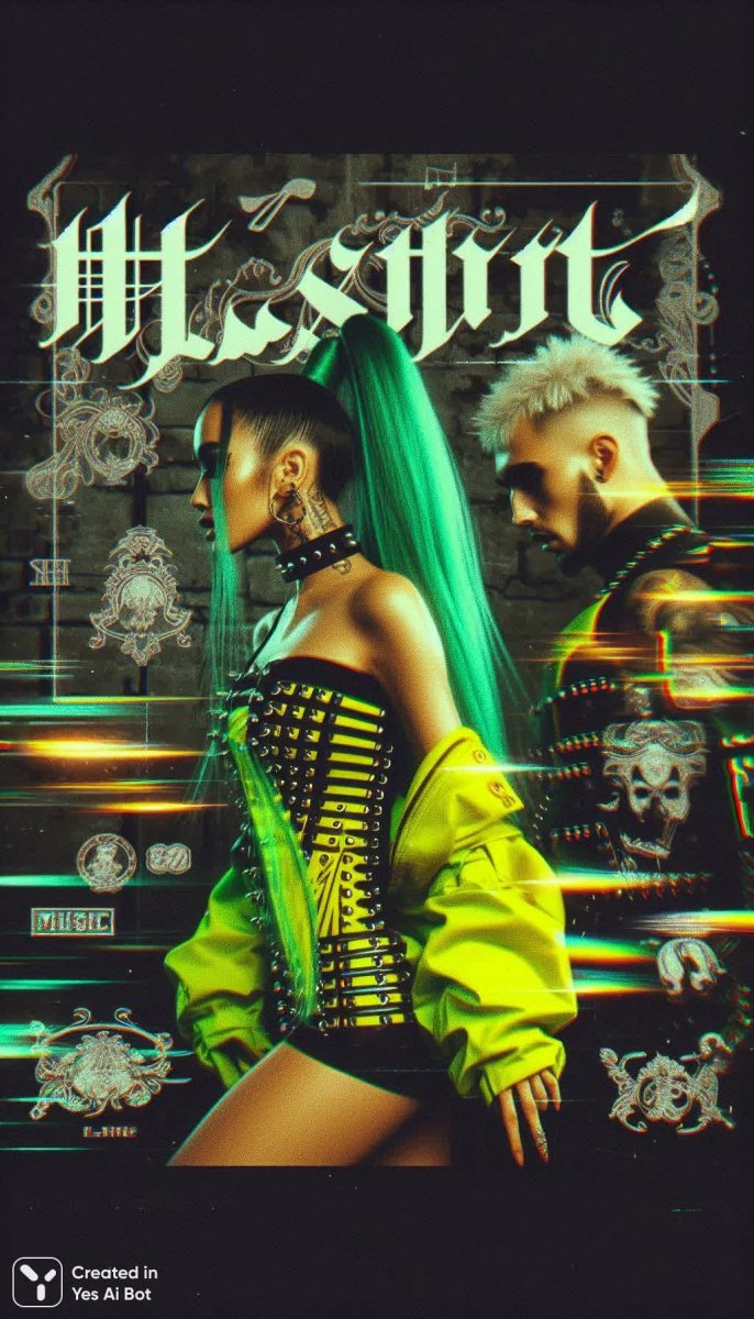 Фото на пленку, просроченный снимок, эффект фотовспышка, неоновый глитч эффект, живое фото, в серых и кислотно‑желто‑зеленых тонах. На фоне готическая надпись: «music», мелкий декоративный текст японские иероглифы комиксными надписями. одеты в яркий over-size свитшот клепки, цепи, поза в движение двое пара фантастические очень красивые fitnes woman с длинными волосами ирокез на бок. И Мужчина, у мужчины короткие волосы выбриты виски: серо‑зеленая потрескавшееся кожа, Кожа потрескавшимся фиолетово серым узором мрамором. Светящиеся молния, Безжизненные серые alien глаза. Лицо покрыто мраморные узором шрамами. На шее - татуировки. Повышанная чет...