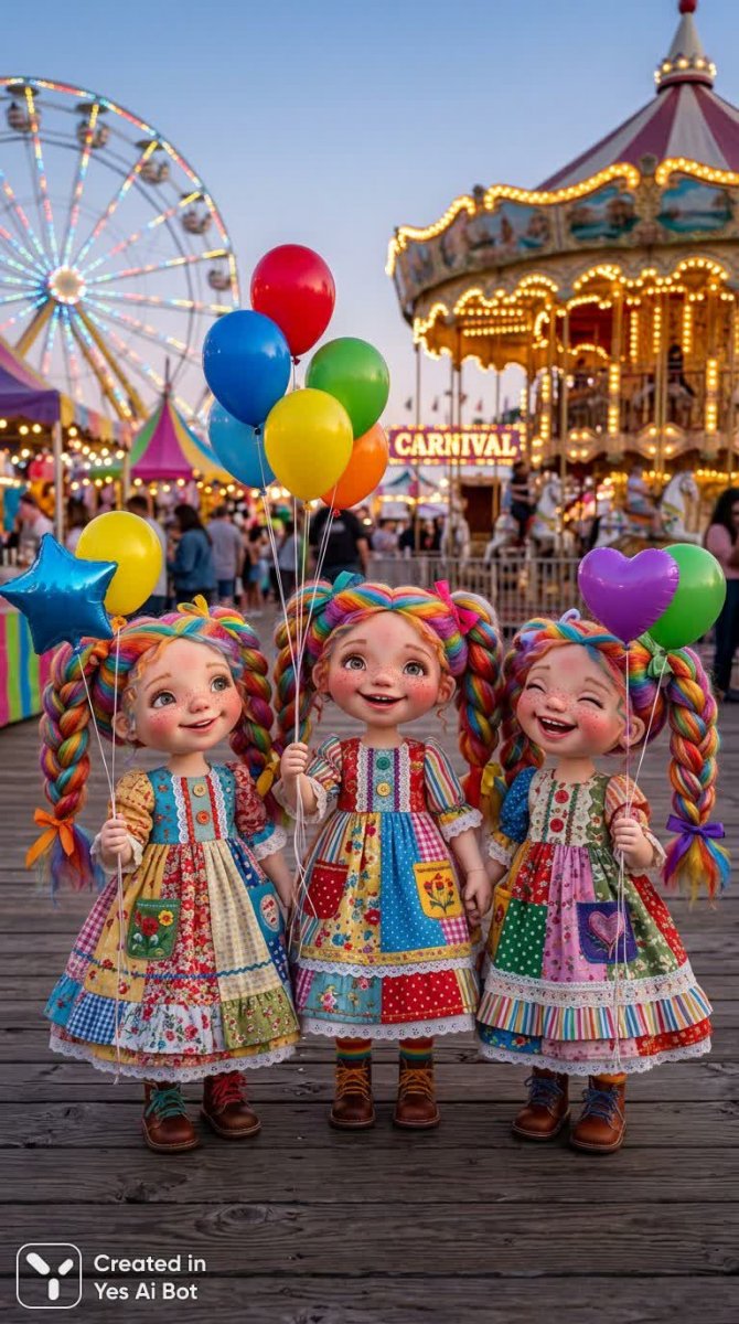 three whimsical dolls, oversized heads with bright freckles, rainbow hair in pigtails, wearing colorful patchwork dresses, holding brightly colored balloons, joyful expressions, carnival-themed BG, soft glowy lighting, playful art style.