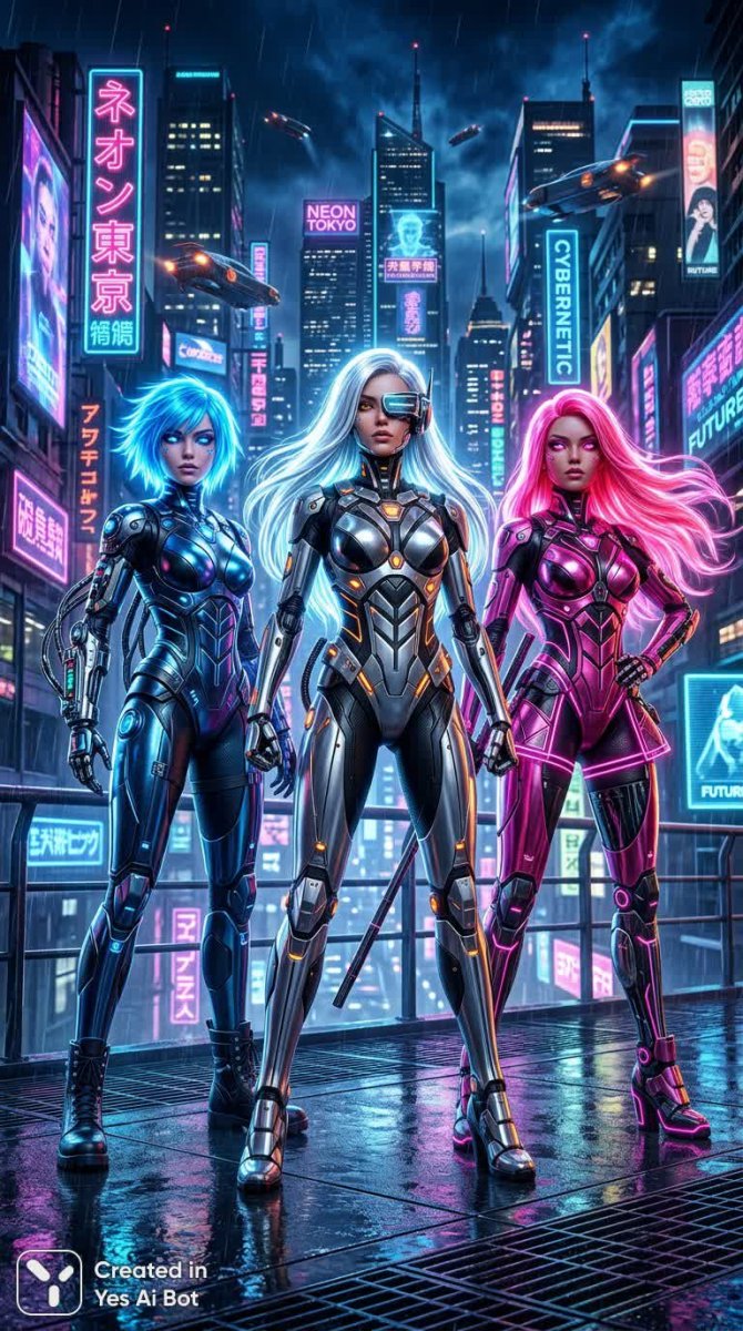 Три футуристические куклы воплощают собой эстетику будущего с яркими акцентами и смелым дизайном. Их волосы сияют неземным светом – серебристый оттенок напоминает о холодной луне, электрический синий добавляет динамики и энергии, а розовый создает эффектный контраст. Куклы оснащены сложными кибернетическими аксессуарами, подчеркивающими их технологичность и связь с цифровым миром. Обтягивающие металлические костюмы выполнены в стильной минималистичной манере, дополненные смелыми геометрическими узорами, которые придают образу графичность и современность. Позы кукол выражают уверенность и силу, отражая дух прогресса и инноваций. За ними простирается неоновый городской пейзаж, создающий атмосферу киберпанка и футуристического мегаполиса. Высококонтрастное освещение подчеркивает детали и текстуры, делая изображение еще более ярким и запоминающимся. Это динамичная иллюстрация, демонстрирующая красоту технологий и смелое сочетание цветов и форм в мире будущего, где границы между реальностью и фантазией стираются. Каждая кукла – это символ прогресса, стиля и индивидуальности в эпоху цифровых инноваций, воплощение мечты о будущем, полном возможностей и ярких красок. Их образы вдохновляют на эксперименты с модой, дизайном и самовыражением, демонстрируя безграничные возможности современного искусства. Иллюстрация захватывает своей динамикой и детализацией, перенося зрителя в мир высоких технологий и футуристической эстетики