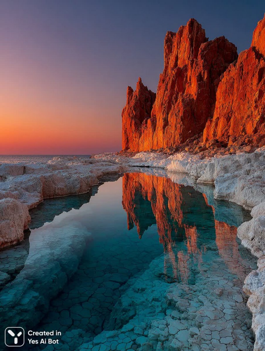 Завораживающий пейзаж неземной красоты, где причудливые белые минеральные образования встречаются с кристально чистыми лазурными водоемами. Небо пылает оттенками оранжевого и пурпурного, отражаясь в спокойной глади воды, создавая ощущение волшебства и безмятежности. На переднем плане – узорчатый бассейн с замысловатыми шестиугольными узорами на поверхности, словно вырезанными искусным мастером. В глубине простирается более крупный водоем, ловящий золотые лучи заката и наполняющий пространство теплом. Величественная белая скала, выточенная самой природой, возвышается над горизонтом слева, добавляя композиции монументальности и загадочности. Картина выполнена с поразительной реалистичностью в кинематографическом стиле, демонстрируя невероятную детализацию и мастерство исполнения благодаря использованию широкоугольной линзы и драматичного освещения. Атмосфера пронизана покоем и ощущением нереальности, словно зритель перенесен в фантастический мир, где царит гармония и красота. Это визуальное произведение искусства захватывает дух своей масштабностью, глубиной цвета и совершенством форм, приглашая задуматься о вечном и неповторимом. Безусловно, это шедевр, достойный восхищения и созерцания