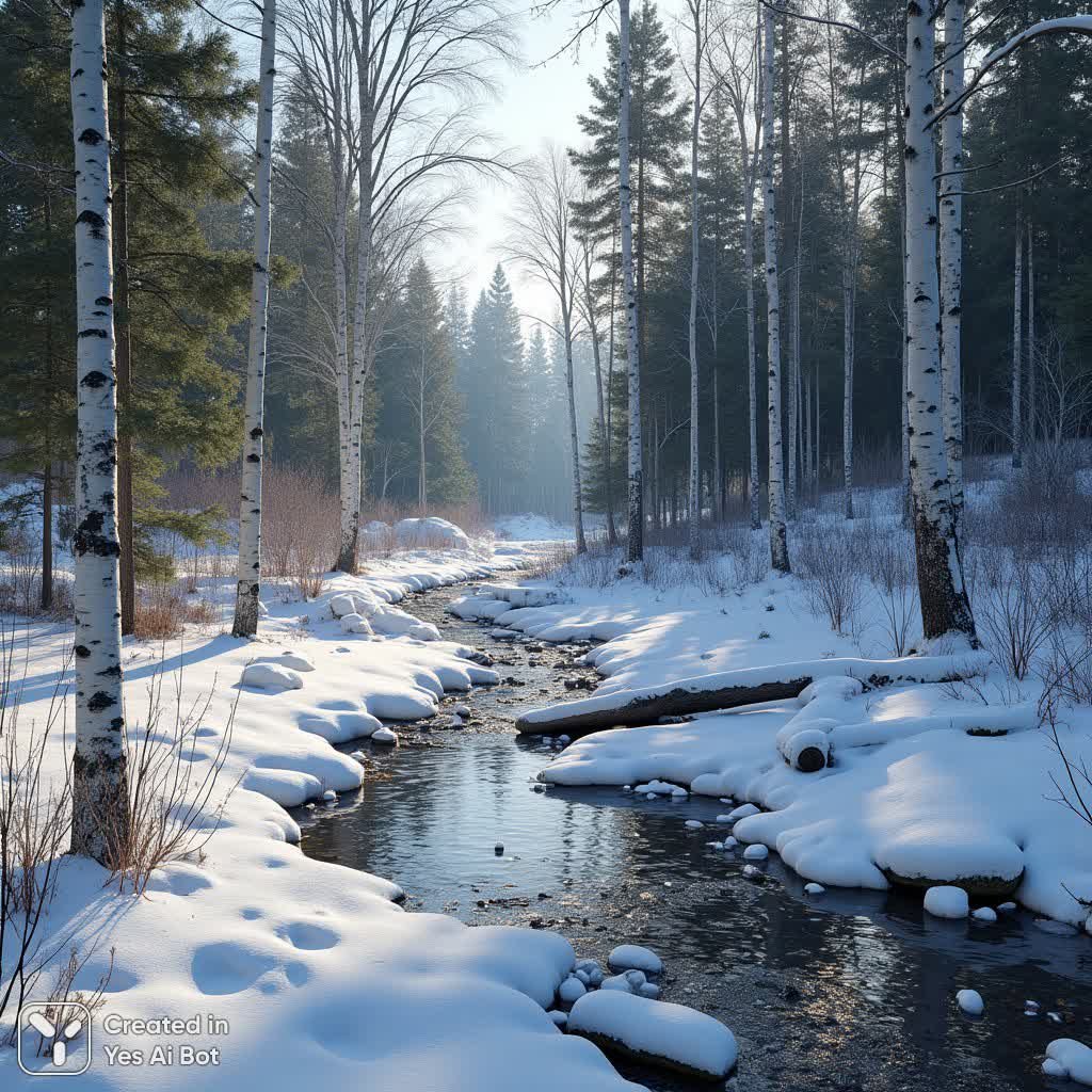 Заснеженный зимний лес, где извилистая река прорезает покрытую снегом землю, создает ощущение покоя и безмятежности. Высокие стройные березы с белой корой и голыми ветвями доминируют на среднем плане, перемежаясь густыми хвойными деревьями, образующими темный, насыщенно-зеленый фон. Белоснежный покров покрывает землю, текстурированный нежными сугробами и усеянный редким сухим кустарником. Солнечный свет пробивается сквозь кроны деревьев, отбрасывая длинные мягкие тени на снег, подчеркивая тонкие оттенки синего и фиолетового в затененных областях. Частично замерзшая река открывает вид на чистую темную воду с видимыми камнями и галькой под ней, обрамленную кусками льда и снега. Поваленное бревно лежит частично погруженным в снег у берега реки, добавляя композиции элемент естественной простоты. Взгляд зрителя естественно устремляется в глубину леса, где река служит естественным путем. Мягкое и рассеянное освещение создает атмосферу тишины и спокойствия, а акцент на свете, тени и природных деталях напоминает классическую живописную школу пейзажа. Общее настроение – это безмолвная тишина и утонченная красота тающего зимнего пейзажа, запечатленная с любовью к деталям и мастерством исполнения. Зимняя сказка в каждом блике света на снегу и каждой детали заснеженных ветвей берез