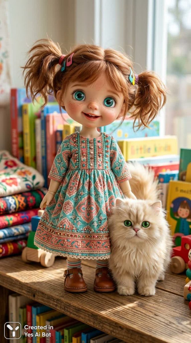 cartoon girl with big expressive eyes, wearing a patterned dress in turquoise and coral, decorated with beads, standing next to a fluffy cream cat with green eyes, vibrant background, playful expression, soft lighting, doll style.
